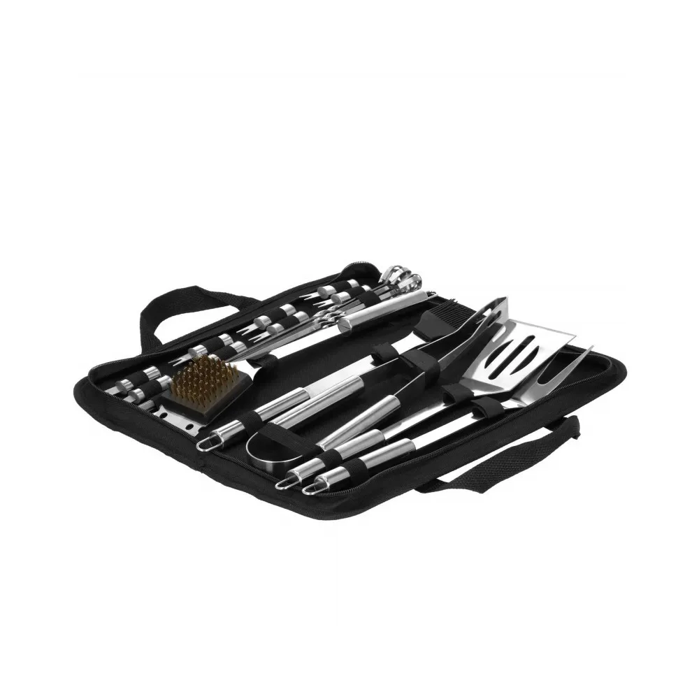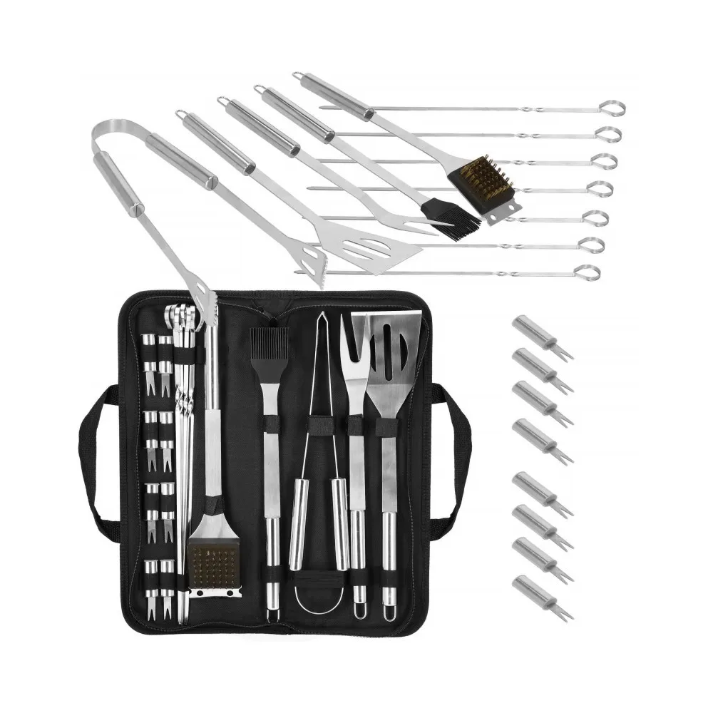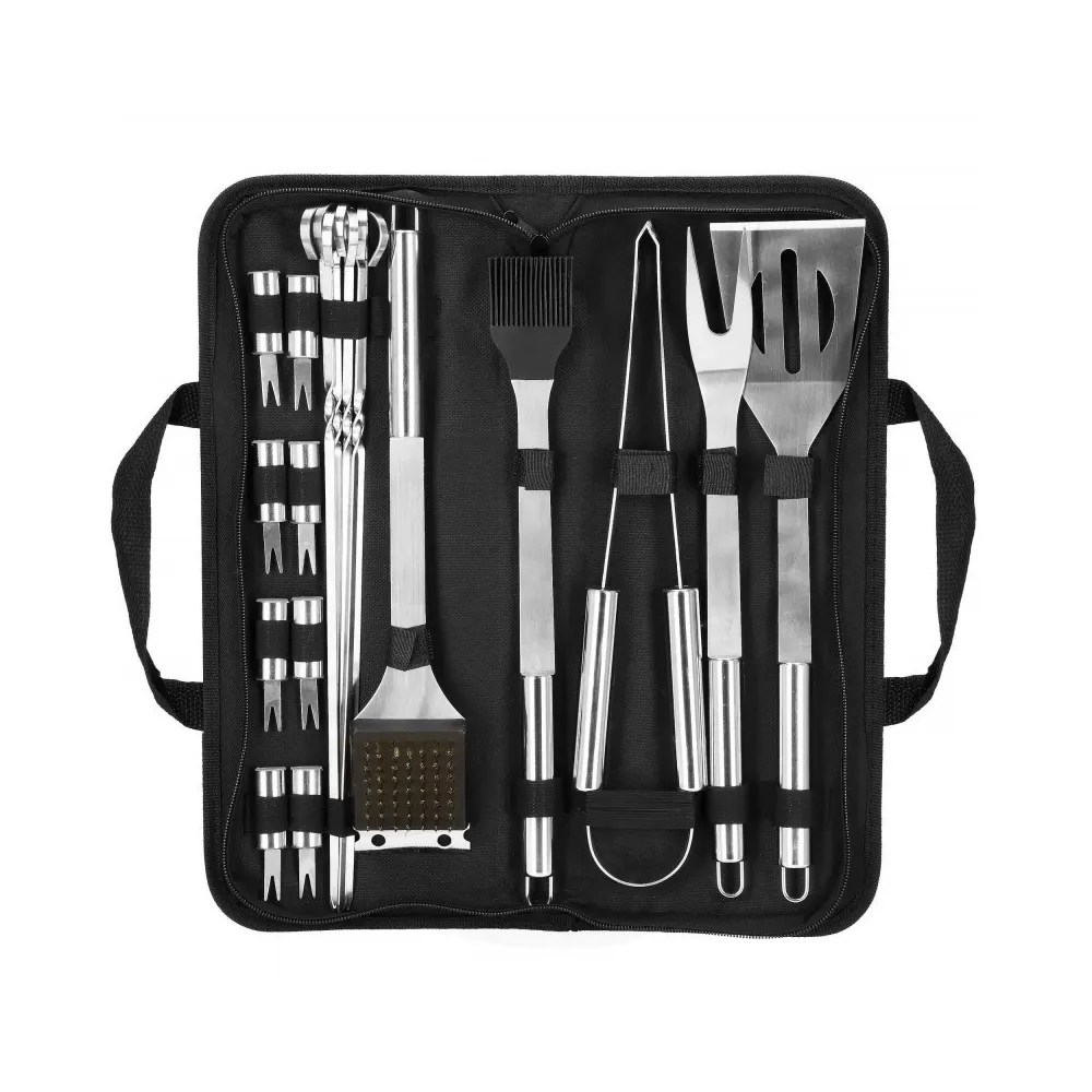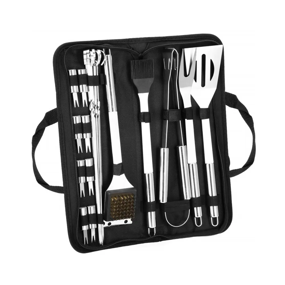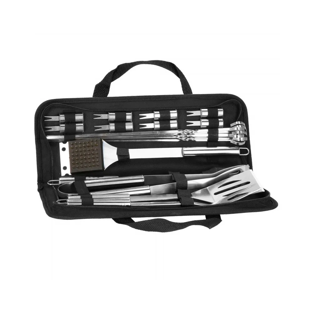 Praktická nerezová sada je vhodná na grilovanie. Pokiaľ plánujete grilovací večer, určite majte všetky potrebné doplnky. Nami ponúkaná grilovacia sada obsahuje 19ks náčinia . Nerezová oceľ, úchyty na zavesenie, ľahko sa čistí a poslúži mnoho sezón. Súprava obsahuje navyše puzdro, do ktorého pohodlne uložíte príslušenstvo bez rizika straty akéhokoľvek prvku.