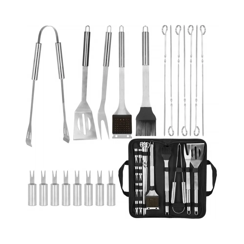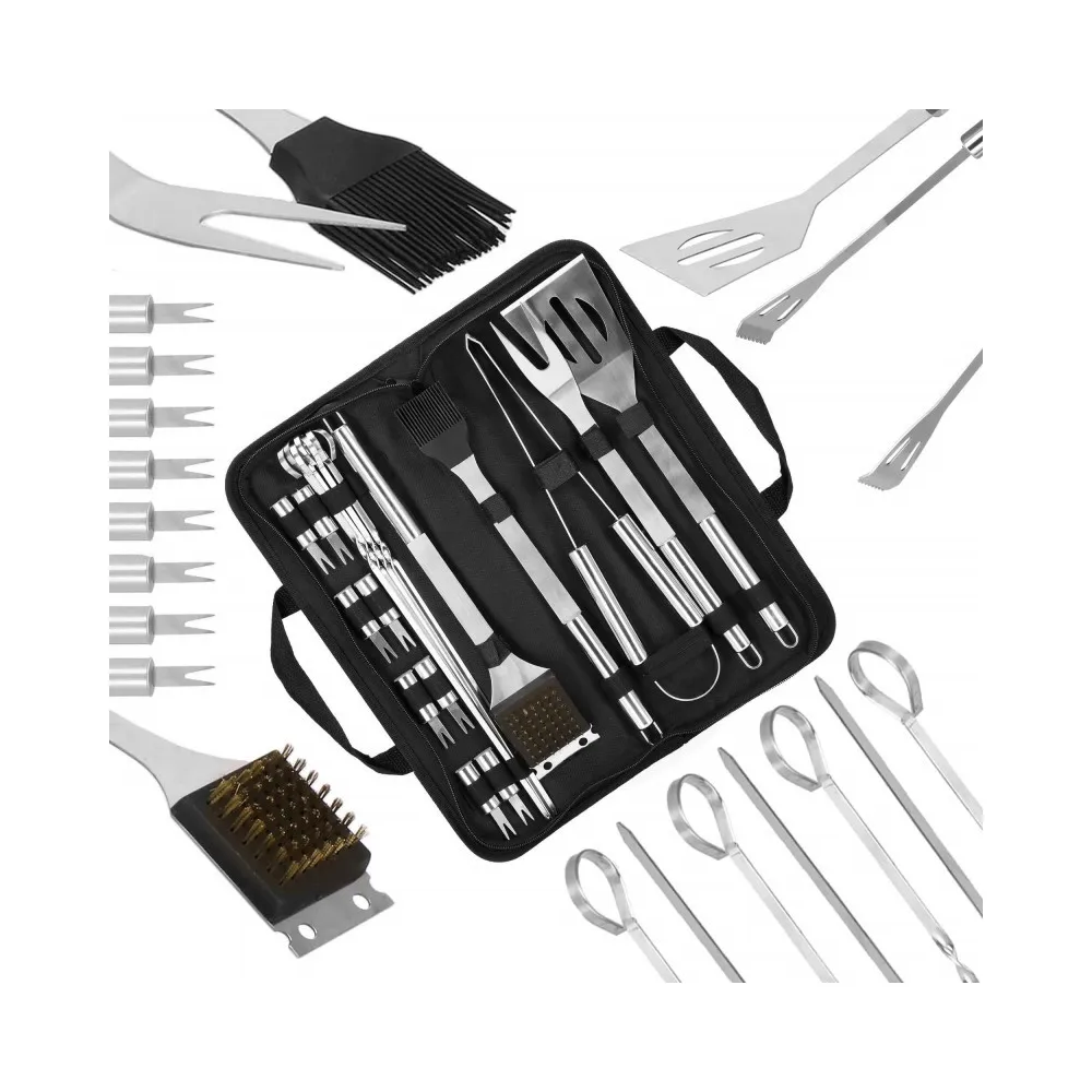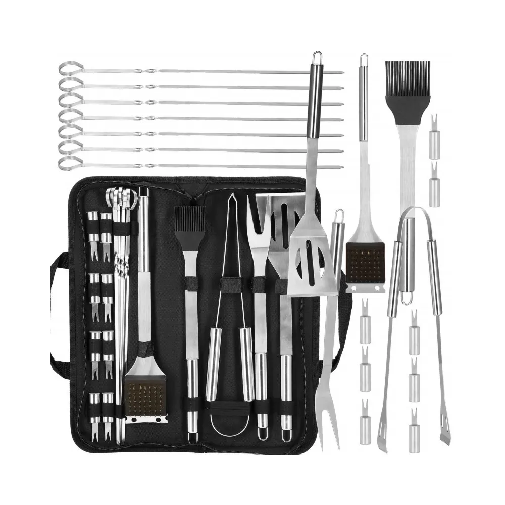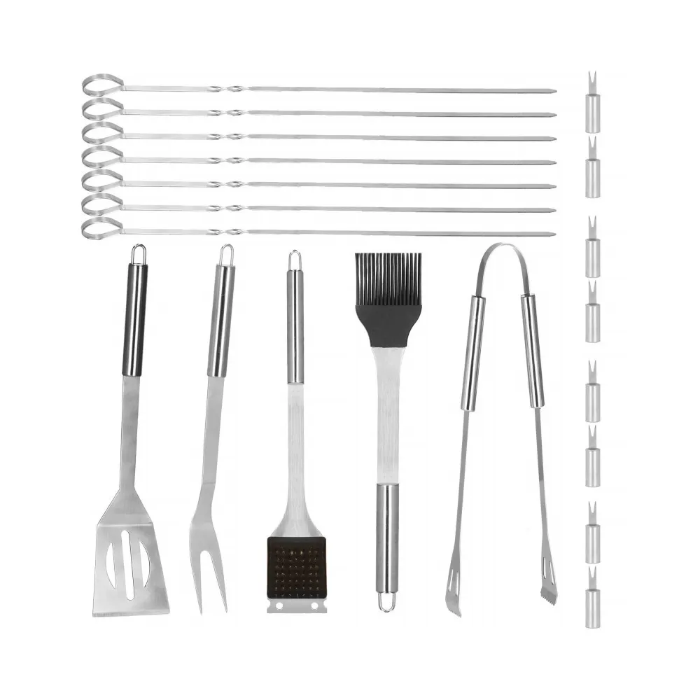 Praktická nerezová sada je vhodná na grilovanie. Pokiaľ plánujete grilovací večer, určite majte všetky potrebné doplnky. Nami ponúkaná grilovacia sada obsahuje 19ks náčinia . Nerezová oceľ, úchyty na zavesenie, ľahko sa čistí a poslúži mnoho sezón. Súprava obsahuje navyše puzdro, do ktorého pohodlne uložíte príslušenstvo bez rizika straty akéhokoľvek prvku.