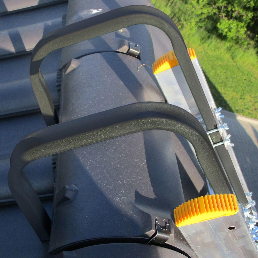 Strešný hák je vybavený dvojicou veľkých a odolných koliesok , ktoré dovoľujú bezpečné vysunutie rebríka po streche bez toho, aby sa poškodili škridly alebo iná strešná krytina.