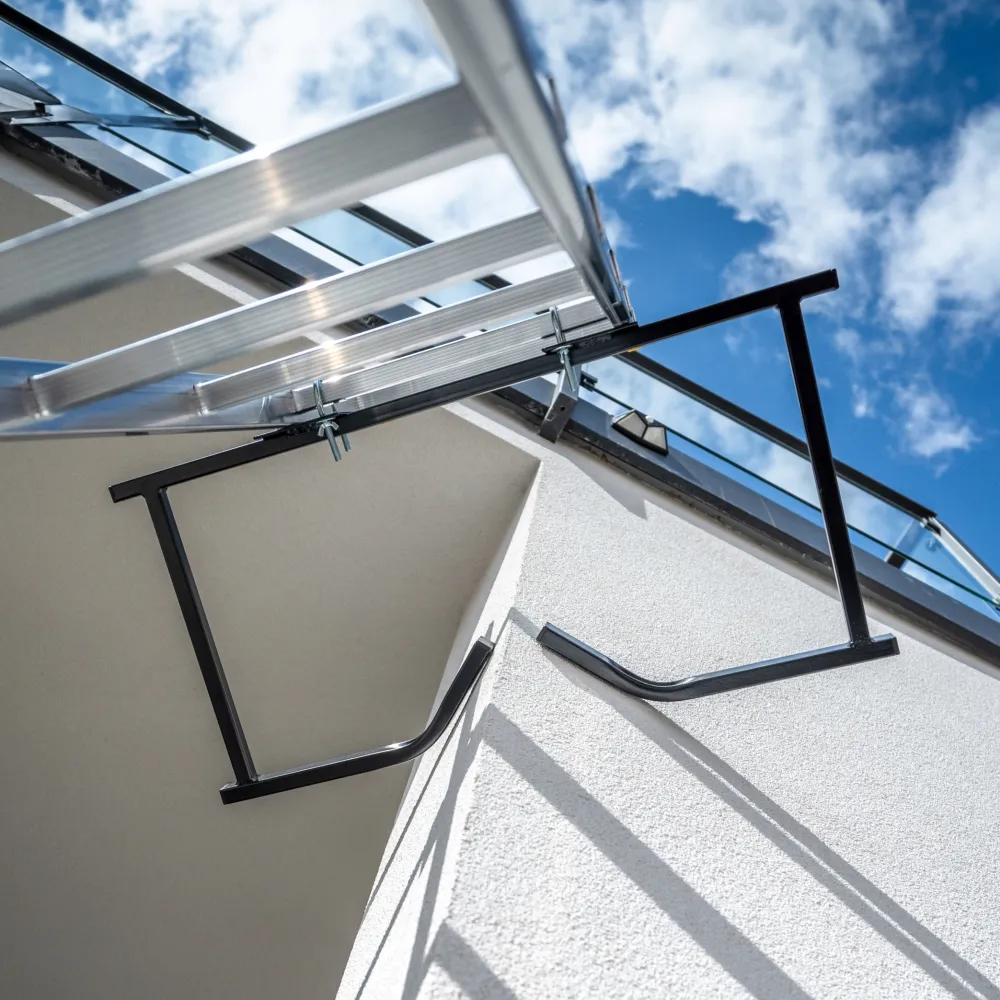 Univerzálny dištančný držiak na bezpečnejšiu prácu na rohoch fasád a odkvapoch. Zaisťuje stabilný odstup rebríka od steny, bráni kymácaniu a zvyšuje bezpečnosť pri výškových prácach. Vhodný pre 1,2 aj 3dielne rebríky. Odolná oceľová konštrukcia s antikoróznym lakom zaručuje dlhú životnosť. Jednoduchá montáž bez náradia, ideálny pomocník na čistenie, opravy aj údržbu. Nosnosť 150 kg.