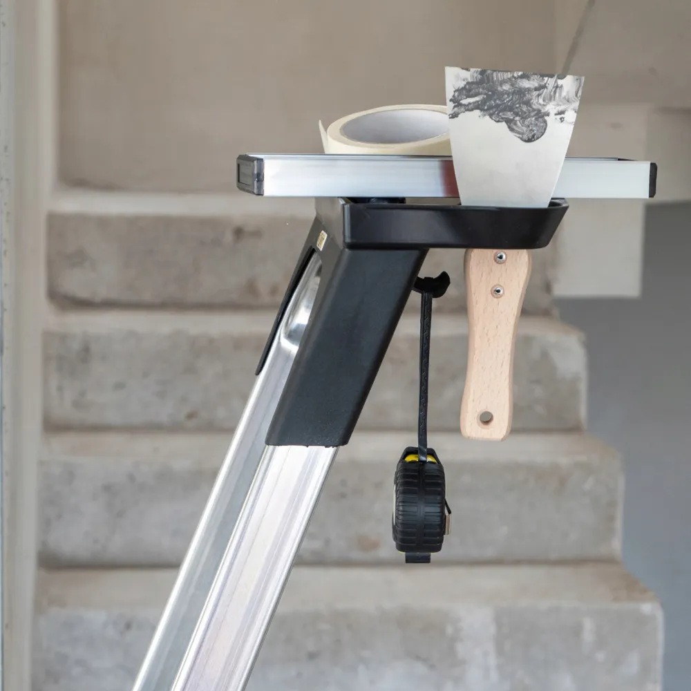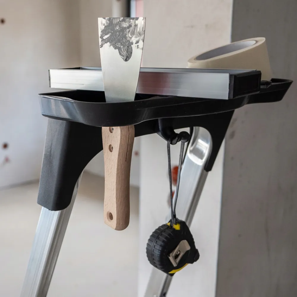 Praktický plastový nadstavec pre schodíky – ideálny pomocník pri maľovaní, rekonštrukciách. Ponúka držiak na náradie, odkladaciu poličku a háčik na vedro, takže máte všetko po ruke.