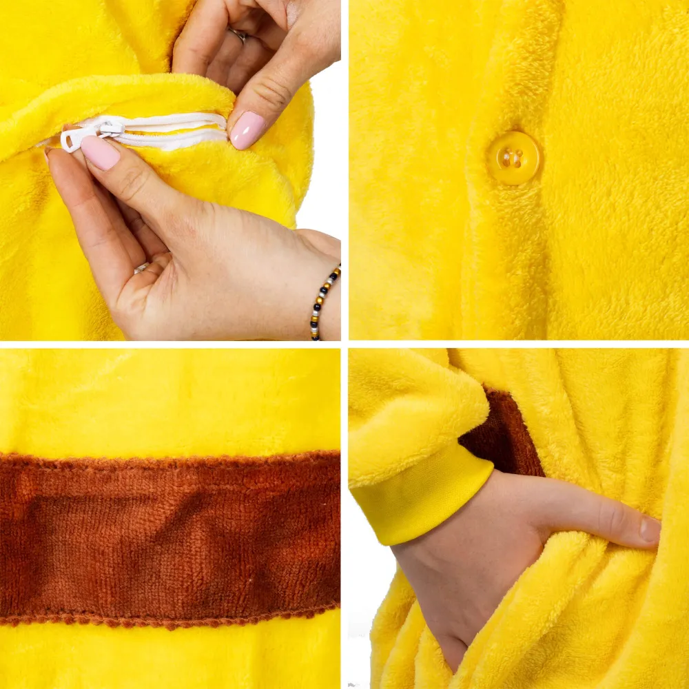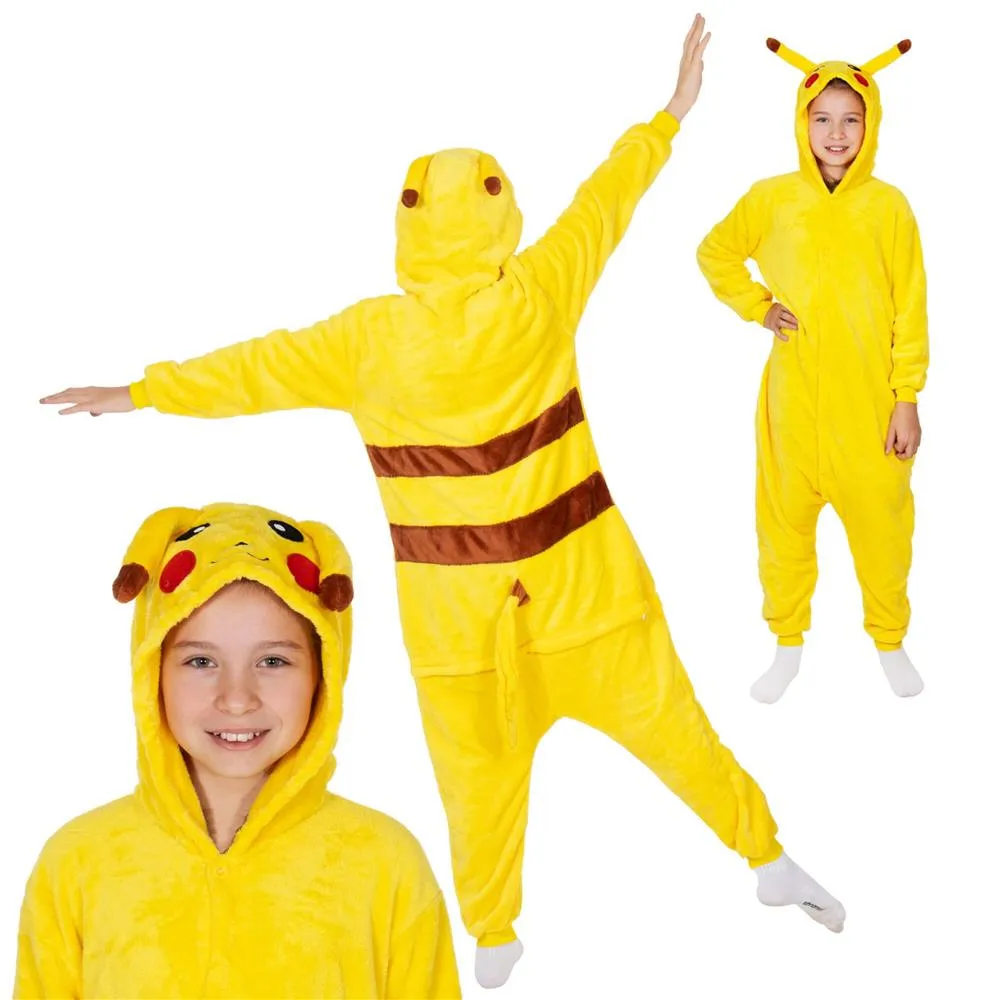 Detské hrejivé pyžamo s rozprávkovým motívom Pikachu. Pohodlný overal štýl so zapínaním na gombíky, elastické zakončenie nohavíc a rukávov. Funčná kapucňa s ušami, hlboké vrecká, rafinovaný zips pre ľahký prístup na toaletu. Perfektný na každodenné nosenie. Skvelé ako pyžamo, denný odev na chladné obdobie alebo štýlový oblek na maškarný. Veľkosť 120-130 cm.