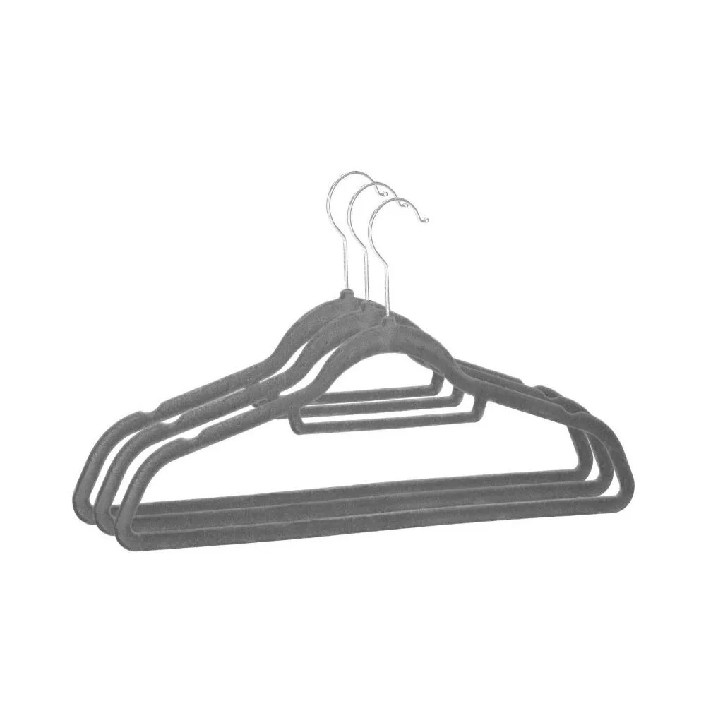 Sada skladajúca sa z 3 velúrových vešiakov v šedej farbe. Špeciálna velúrová úprava, praktické priehlbiny na bokoch, vďaka ktorým blúzky, košele, saká a šaty nešmýkajú. Kovový háčik má funkciu otáčania o 360 stupňov, spodná tyčka, elegantný a funkčný vzhľad. Praktický doplnok vašej skrine.