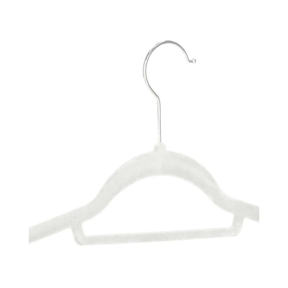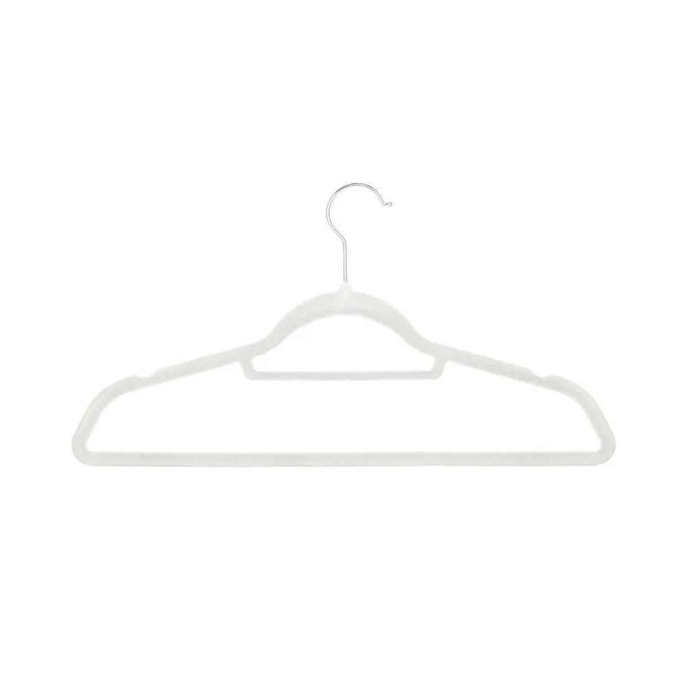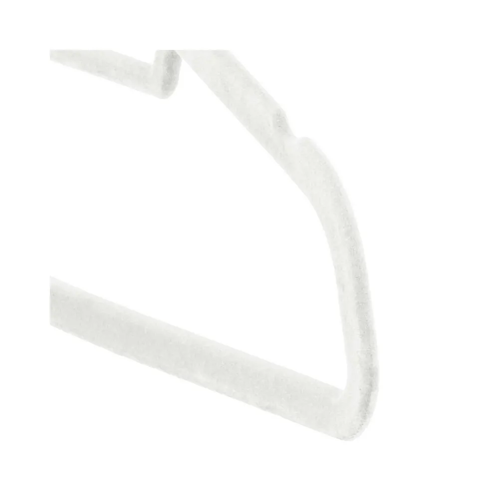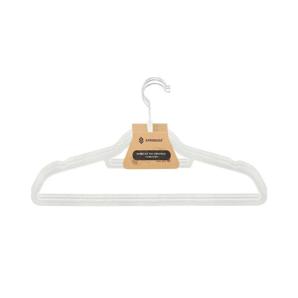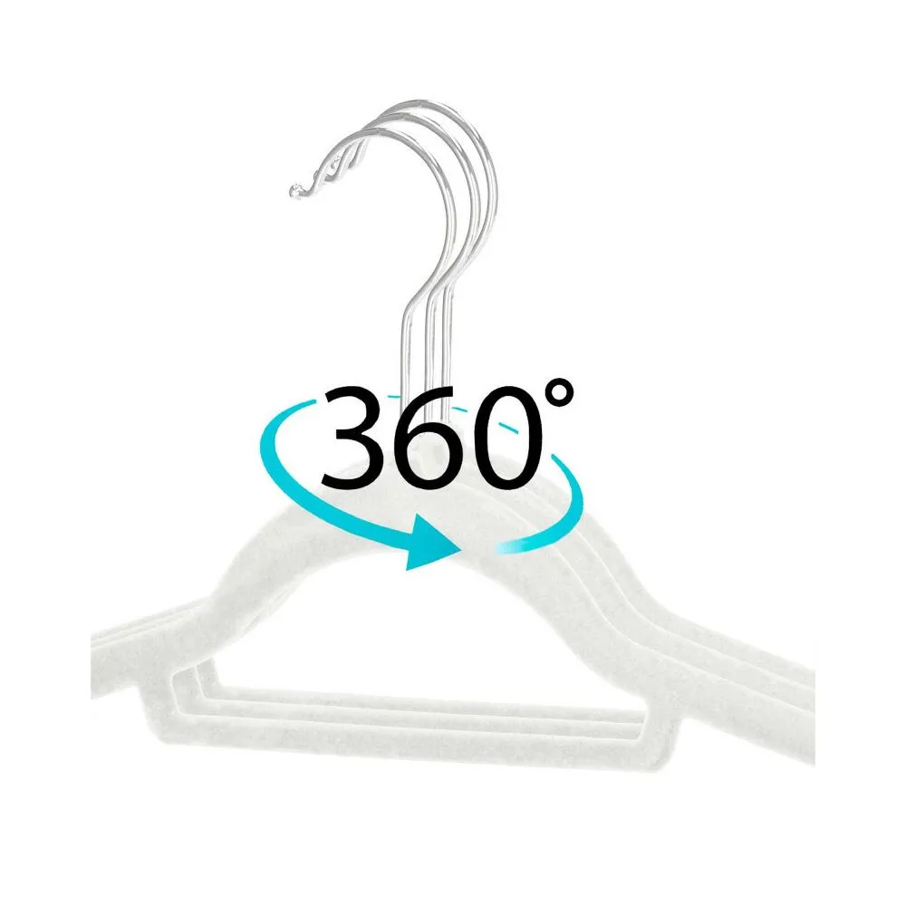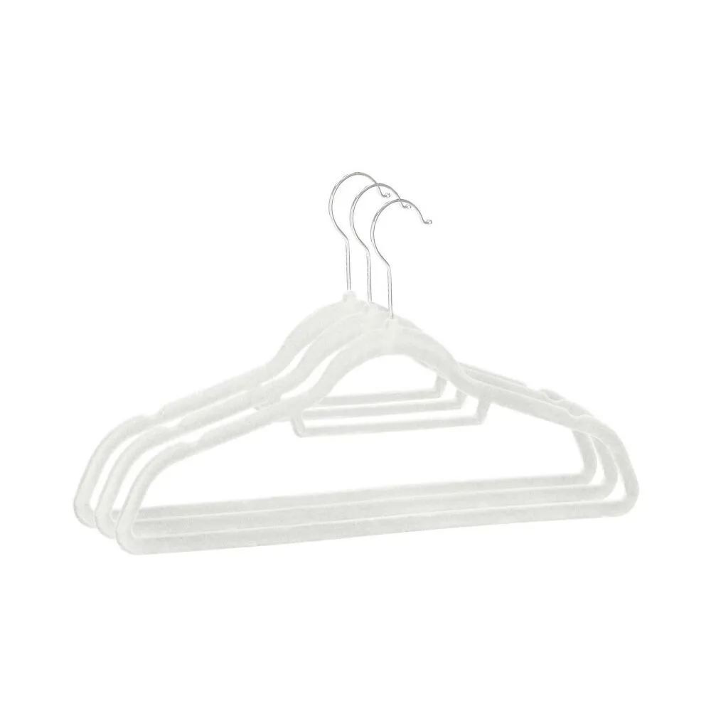 Sada skladajúca sa z 3 velúrových vešiakov v bielej farbe. Špeciálna velúrová úprava, praktické priehlbiny na bokoch, vďaka ktorým blúzky, košele, saká a šaty nešmýkajú. Kovový háčik má funkciu otáčania o 360 stupňov, spodná tyčka, elegantný a funkčný vzhľad. Praktický doplnok vašej skrine.