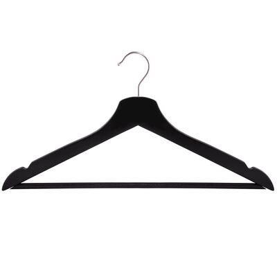 Elegantné šatníkové ramienka v čiernej farbe dreva, sada 20 ks. Vhodná na šaty, košele, nohavice a ďalšie aj ťažšie oblečenie. Lakovaná, vyrobená z masívneho dreva. Klasický tvar so spodnou tyčkou na nohavice. Postranné vykrojenie na dámske oblečenie. Otočný kovový háčik o 360 °. Šírka 42,5 cm.