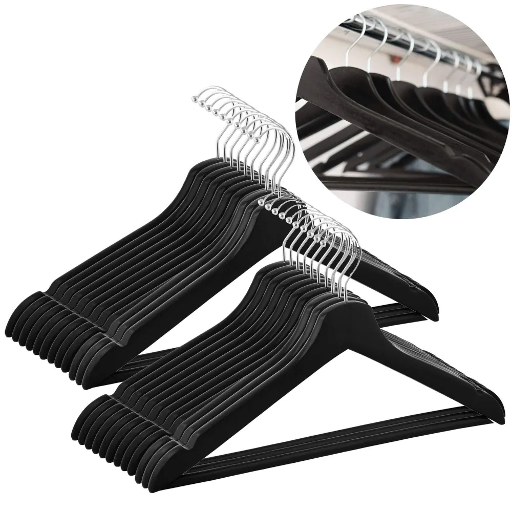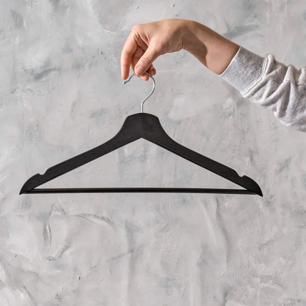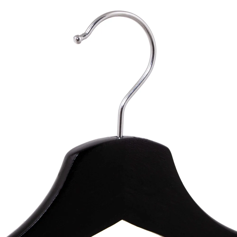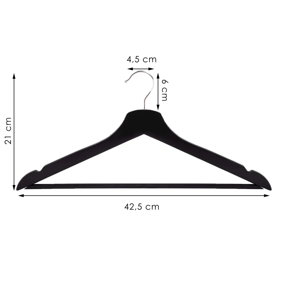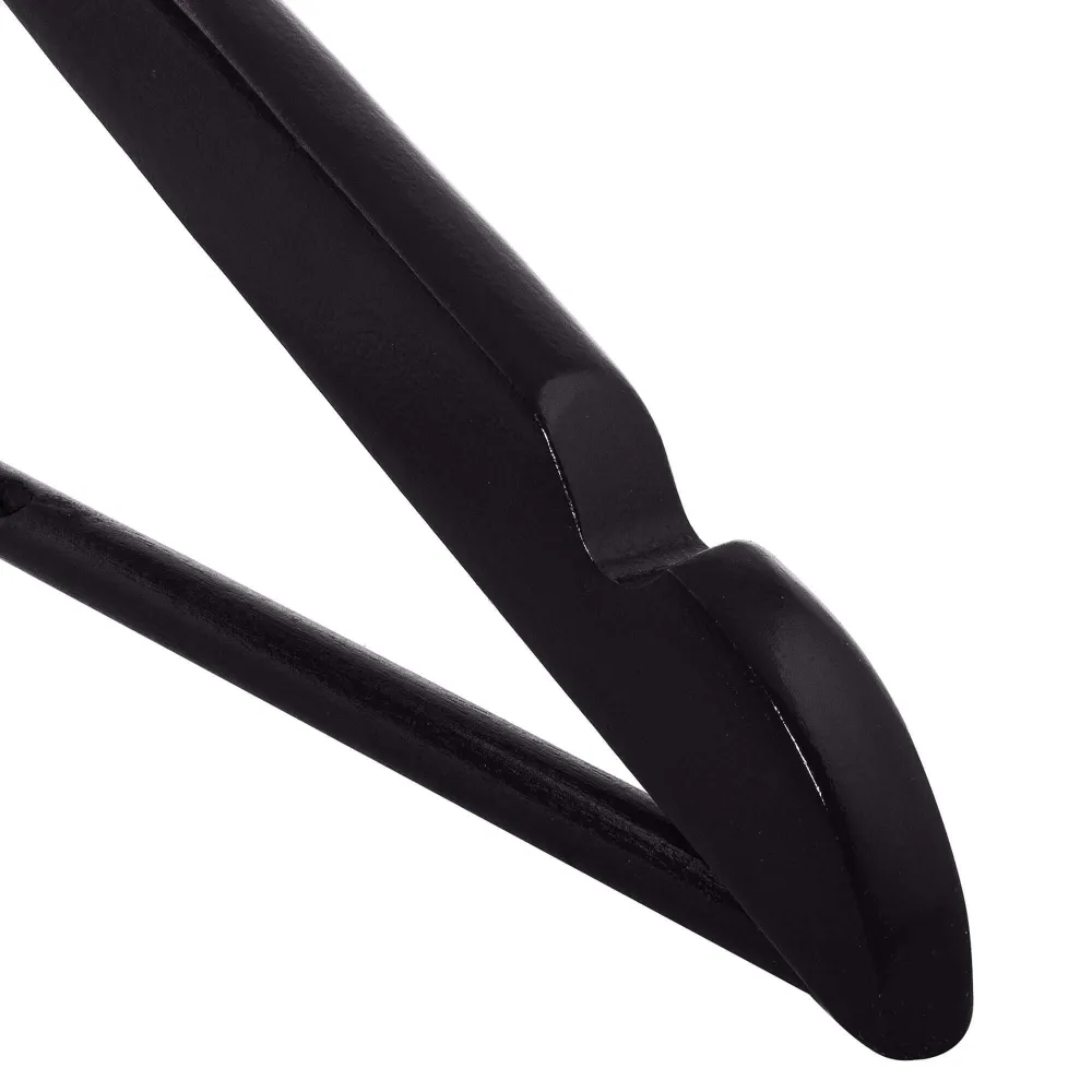 Elegantné šatníkové ramienka v čiernej farbe dreva, sada 20 ks. Vhodná na šaty, košele, nohavice a ďalšie aj ťažšie oblečenie. Lakovaná, vyrobená z masívneho dreva. Klasický tvar so spodnou tyčkou na nohavice. Postranné vykrojenie na dámske oblečenie. Otočný kovový háčik o 360 °. Šírka 42,5 cm.