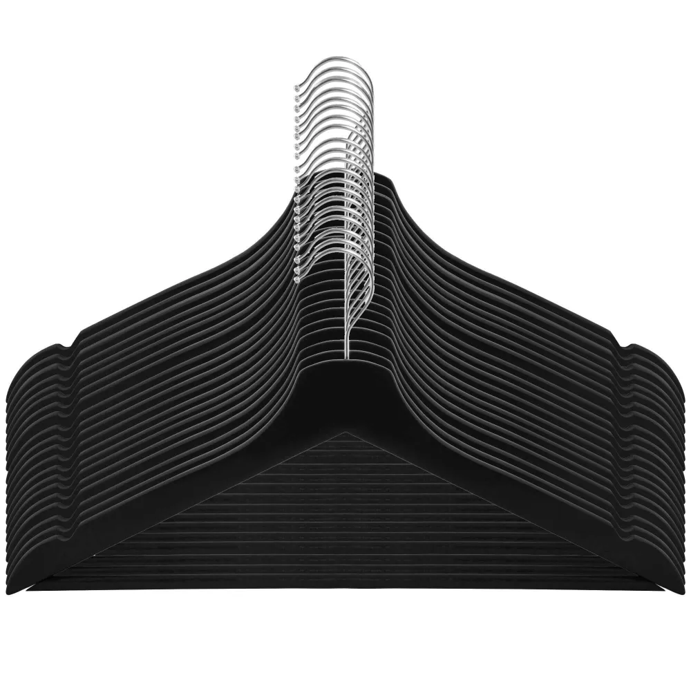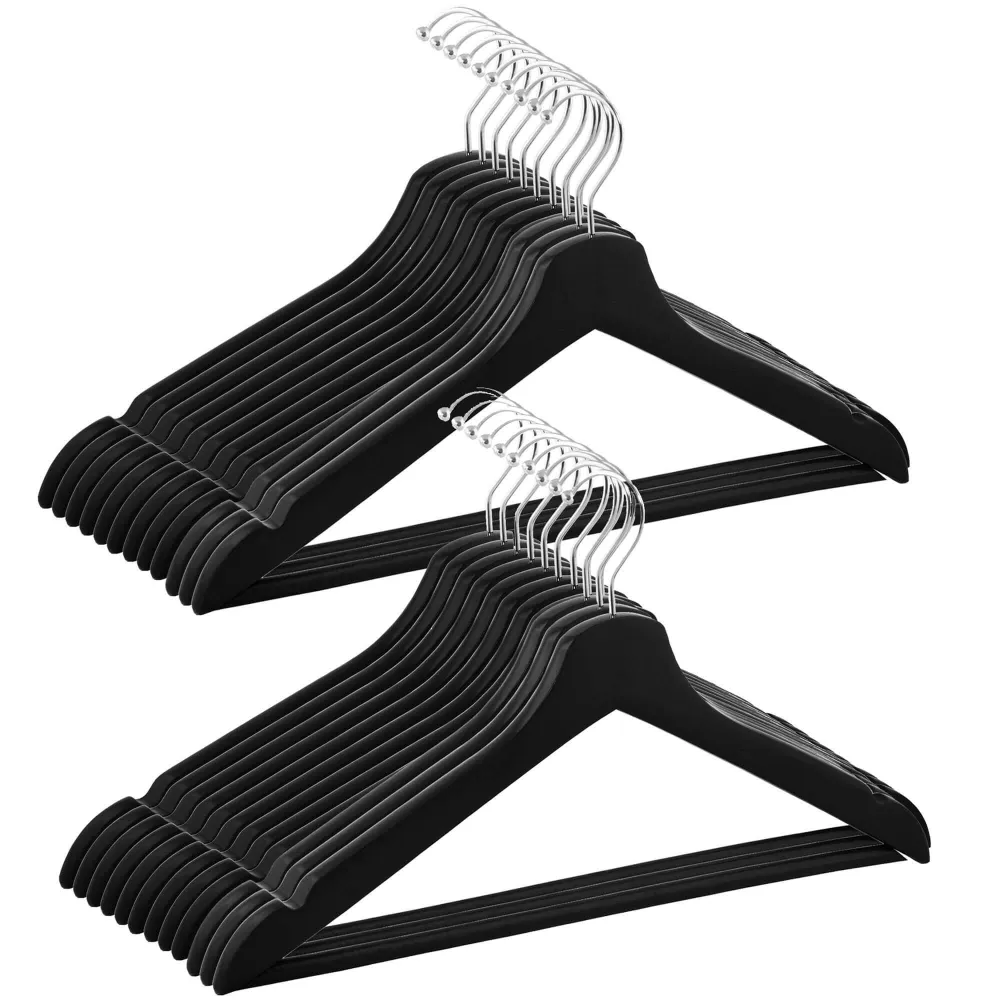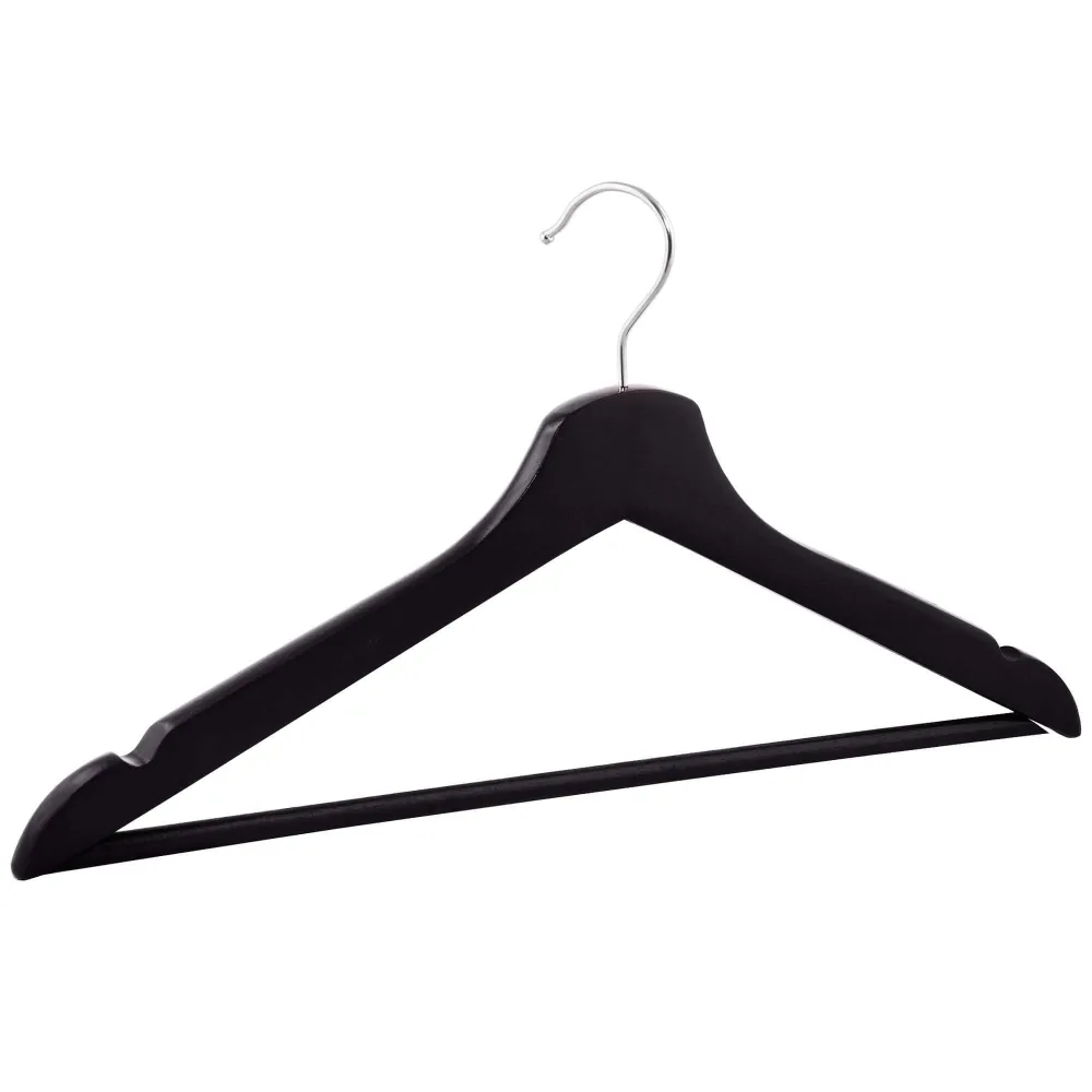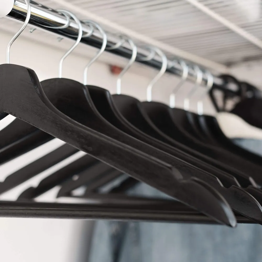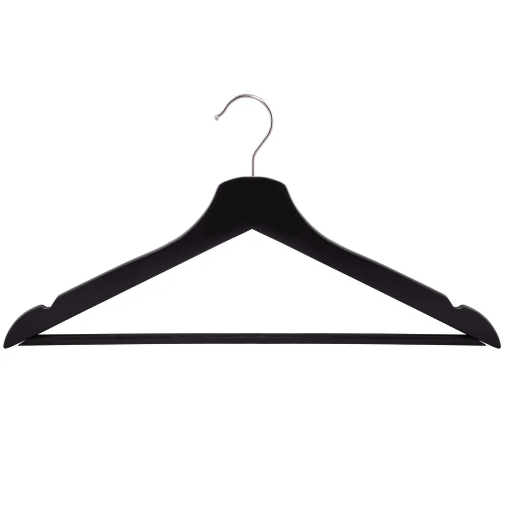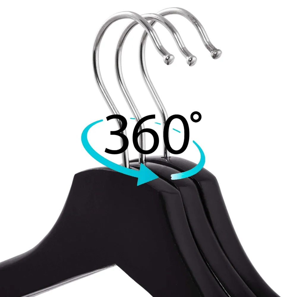 Elegantné šatníkové ramienka v čiernej farbe dreva, sada 20 ks. Vhodná na šaty, košele, nohavice a ďalšie aj ťažšie oblečenie. Lakovaná, vyrobená z masívneho dreva. Klasický tvar so spodnou tyčkou na nohavice. Postranné vykrojenie na dámske oblečenie. Otočný kovový háčik o 360 °. Šírka 42,5 cm.