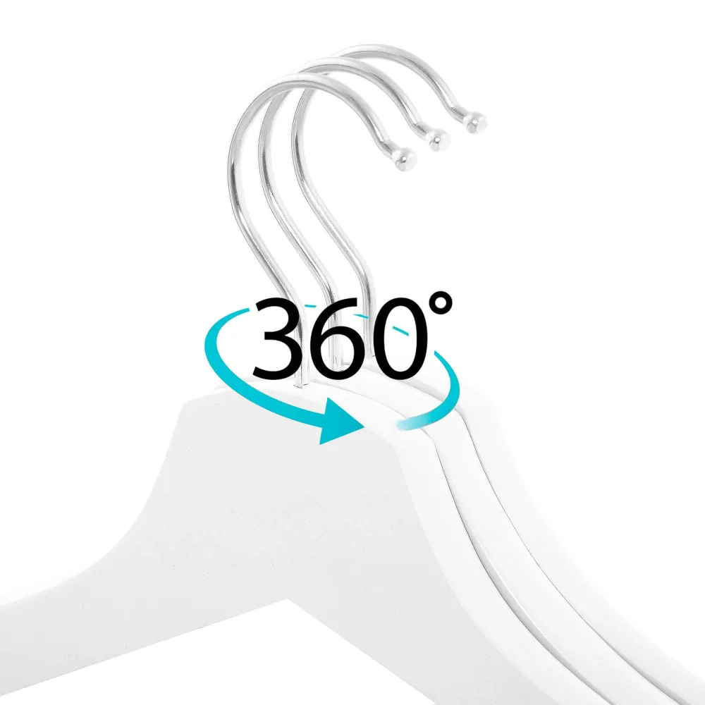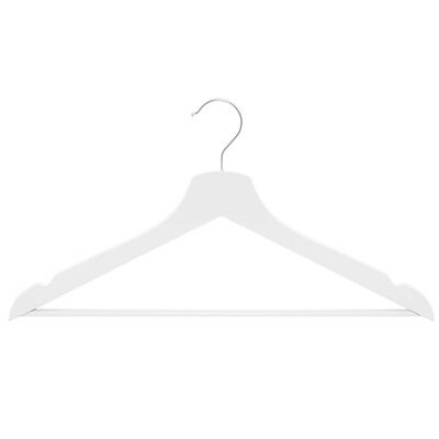 Elegantné šatníkové ramienka v bielej farbe dreva, sada 20 ks. Vhodná na šaty, košele, nohavice a ďalšie aj ťažšie oblečenie. Lakovaná, vyrobená z masívneho dreva. Klasický tvar so spodnou tyčkou na nohavice. Postranné vykrojenie na dámske oblečenie. Otočný kovový háčik o 360 °. Šírka 42,5 cm.