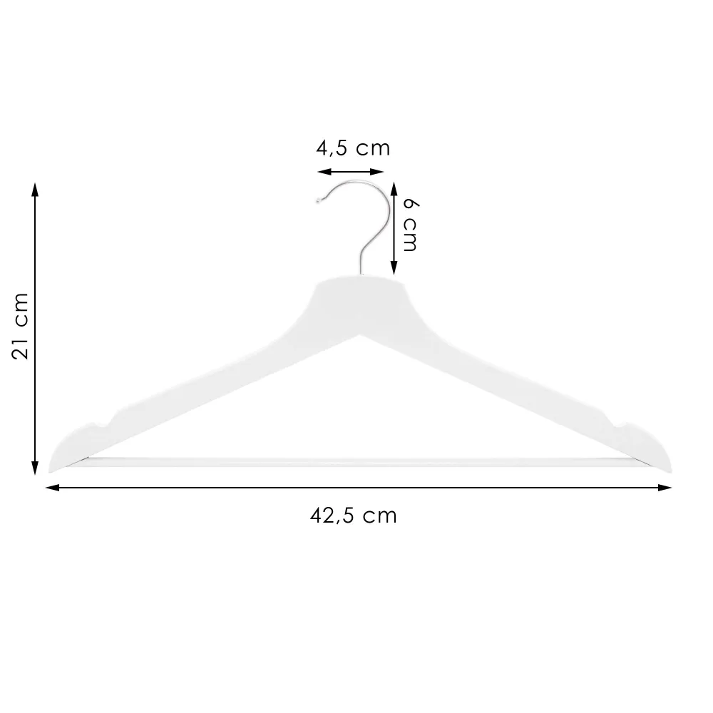 Elegantné šatníkové ramienka v bielej farbe dreva, sada 20 ks. Vhodná na šaty, košele, nohavice a ďalšie aj ťažšie oblečenie. Lakovaná, vyrobená z masívneho dreva. Klasický tvar so spodnou tyčkou na nohavice. Postranné vykrojenie na dámske oblečenie. Otočný kovový háčik o 360 °. Šírka 42,5 cm.