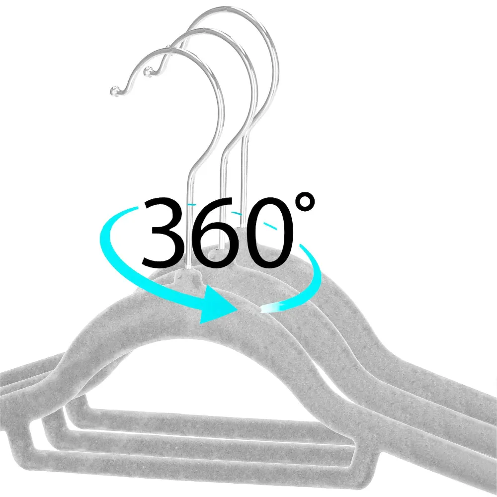 Velúrové šatníkové ramienka v šedej farbe, sada 20 ks. Vhodná na šaty, košele, nohavice a ďalšie oblečenie. Zamatovo hladký protišmykový povrch. Moderný tvar so spodnou tyčkou na nohavice a hornou priečkou na kravaty alebo opasok. Postranné vykrojenie na dámske odevy. Otočný kovový háčik o 360 °. Šírka 45 cm.
