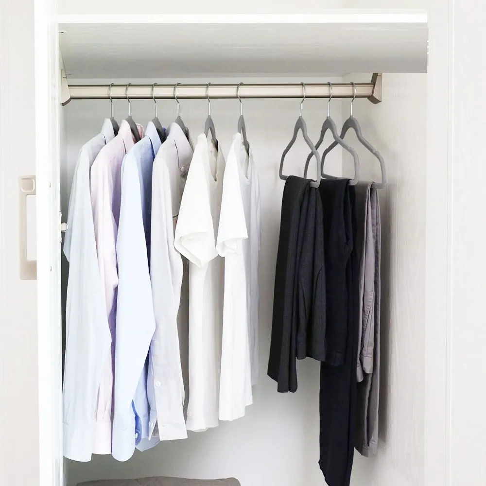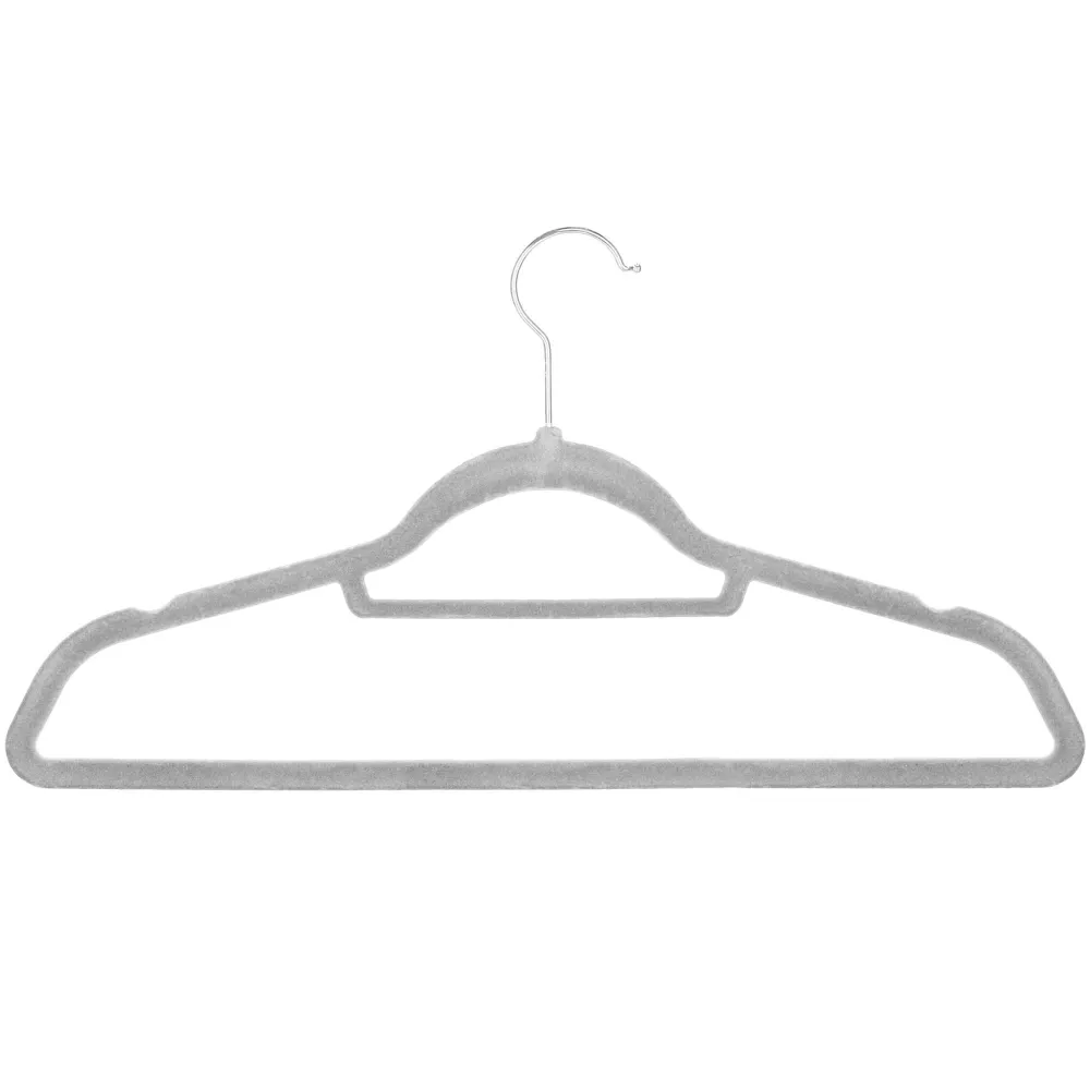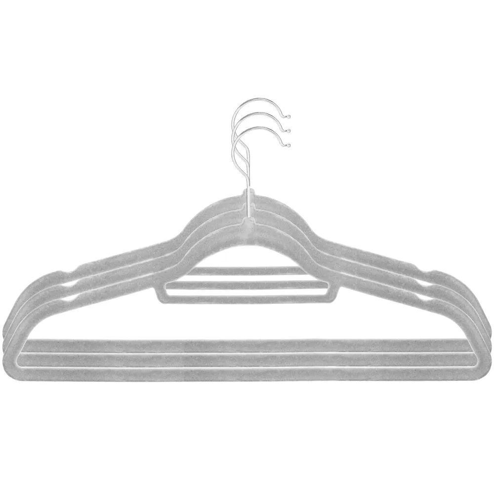 Velúrové šatníkové ramienka v šedej farbe, sada 20 ks. Vhodná na šaty, košele, nohavice a ďalšie oblečenie. Zamatovo hladký protišmykový povrch. Moderný tvar so spodnou tyčkou na nohavice a hornou priečkou na kravaty alebo opasok. Postranné vykrojenie na dámske odevy. Otočný kovový háčik o 360 °. Šírka 45 cm.