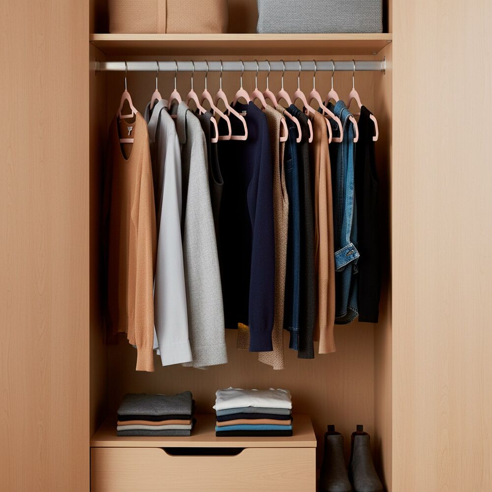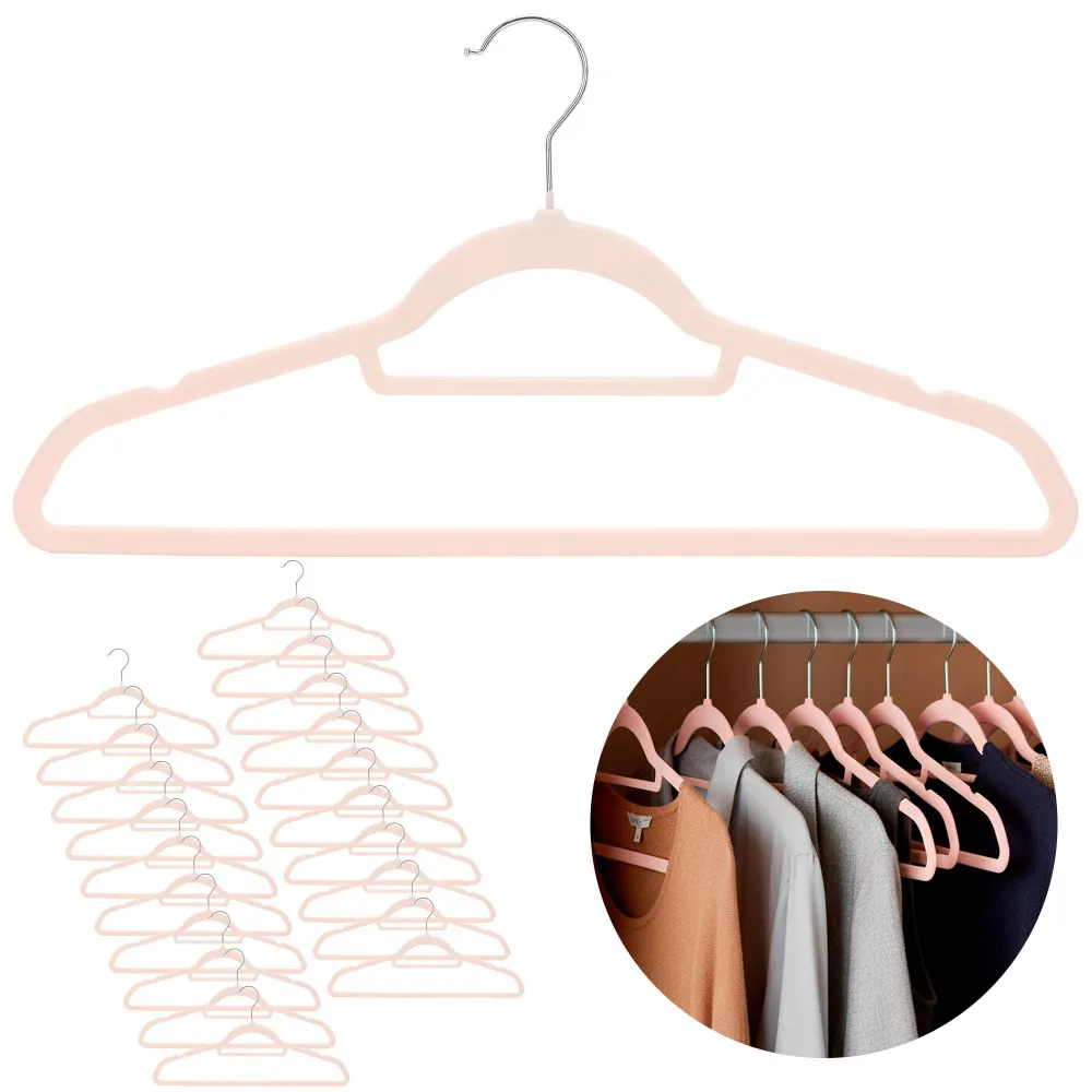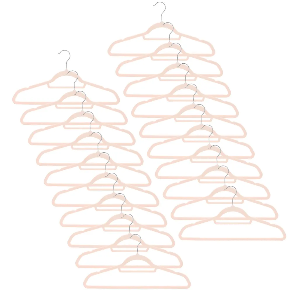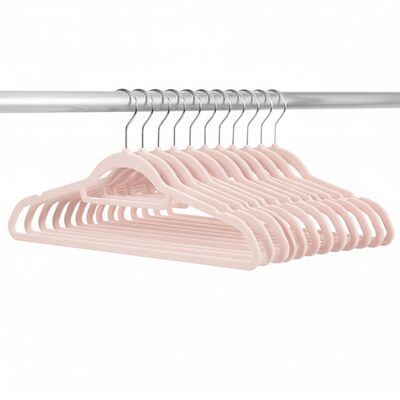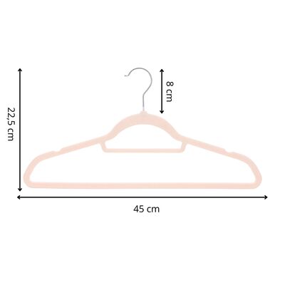 Sada 20 šatňových ramienok s jemným zamatovým, protišmykovým povrchom udrží oblečenie bezpečne na mieste bez skĺzania. Púdrovo ružová farba dodá šatníku elegantný vzhľad, štíhly tvar šetrí miesto v skrini. Ramienka na šaty sú šetrné k látkam a vhodné aj pre citlivé materiály. Kovový otočný hák 360 ° umožňuje ľahké zavesenie, šírka 45 cm zaisťuje univerzálne použitie.