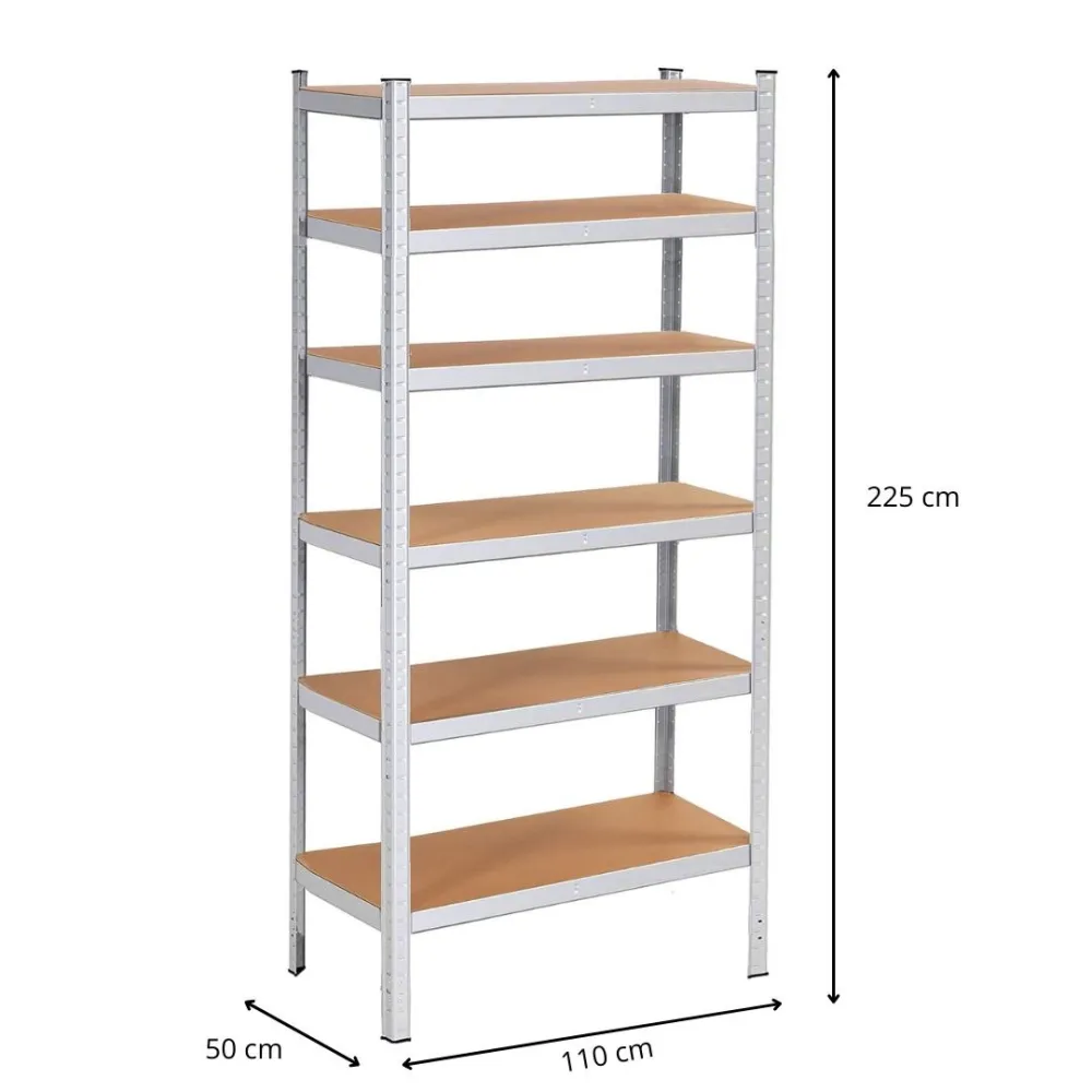 Vysoký a priestranný regál s nosnosťou 1050 kg. Variabilné zostavenie, stabilná bezskrutková konštrukcia, rýchla montáž, výškovo nastaviteľné police. Pozinkované prevedenie so 6 MDF policami. Rozmery 225x110x50 cm.