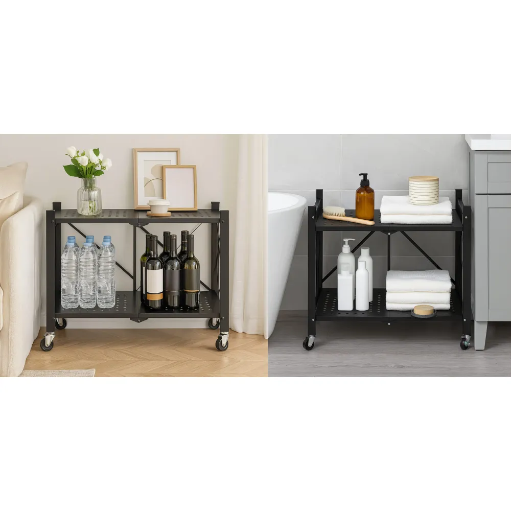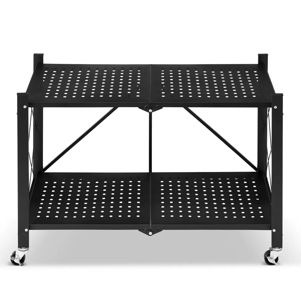 Praktický mobilný regál so stabilnou kovovou konštrukciou a elegantným čiernym lakovaním. Ponúka dve priestranné perforované police a nosnosť 100 kg. Vďaka pantovému skladaciemu systému je ľahko skladovateľný a 360 ° kolieska s brzdami zaisťujú skvelú mobilitu. Ideálne do domácnosti, kancelárie, kúpeľne, garáže či skladu. Rozmery 70x35x50 kg, nosnosť na polici 50 kg, celková nosnosť 100 kg, hmotnosť 5 kg.