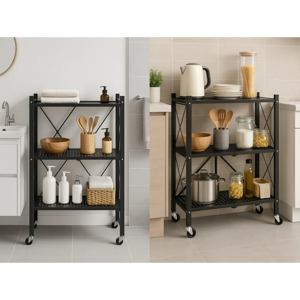 Praktický mobilný regál so stabilnou kovovou konštrukciou a elegantným čiernym lakovaním. Ponúka tri priestranné perforované police a nosnosť 150 kg. Vďaka pantovému skladaciemu systému je ľahko skladovateľný a 360 ° kolieska s brzdami zaisťujú skvelú mobilitu. Ideálne do domácnosti, kancelárie, kúpeľne, garáže či skladu. Rozmery 70x35x87 kg, nosnosť na polici 50 kg, celková nosnosť 150 kg, hmotnosť 7 kg.