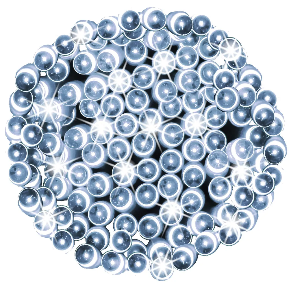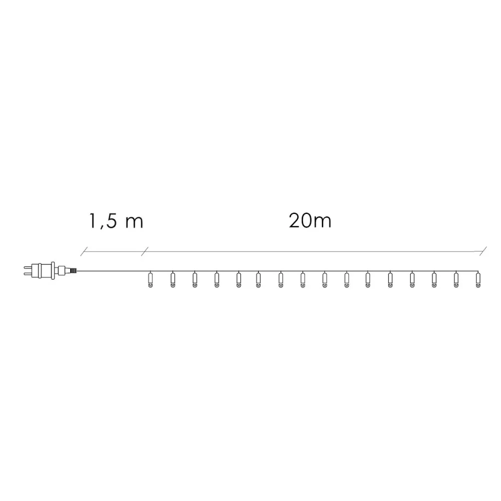 LED svetelná reťaz s 8 svetelnými funkciami a pamäťou posledného režimu. Úsporné mikro diódy, vnútorné použitie, krytie IP20. Dĺžka svetelnej časti 20 m, napájací kábel 1,5 m. Farba studená biela, 300 ľad.