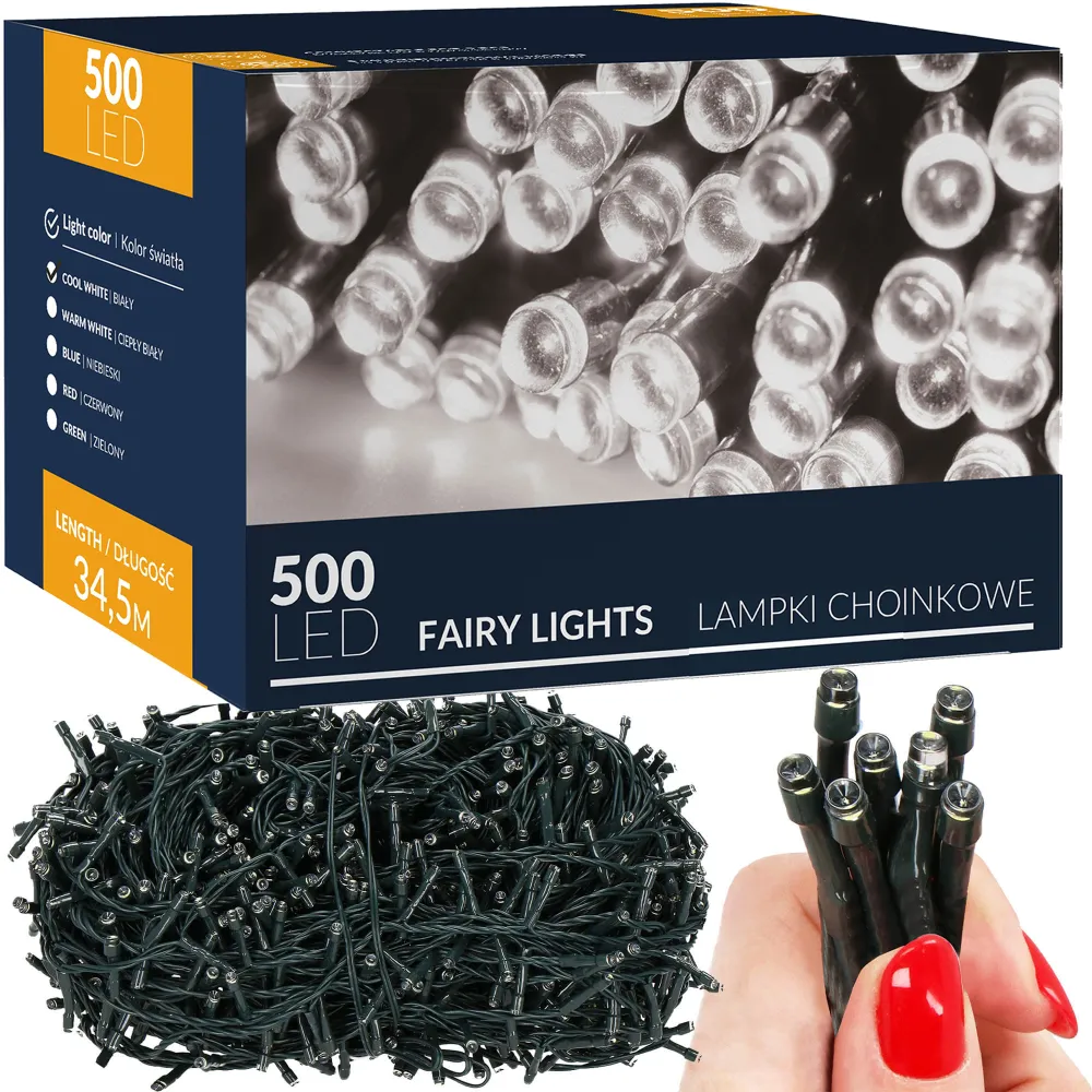 LED svetelná reťaz s 8 svetelnými funkciami. Úsporné diódy, vnútorné použitie, krytie IP20. Dĺžka svetelnej časti 33 m, napájací kábel 1,5 m. Farba studená biela, 500 ľad.