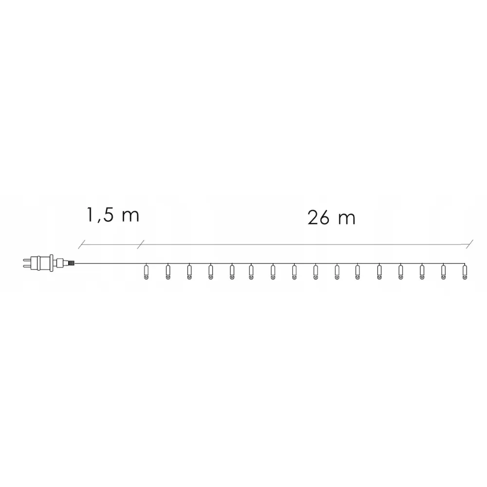 LED svetelná reťaz s 8 svetelnými funkciami. Úsporné diódy, vnútorné použitie, krytie IP20. Dĺžka svetelnej časti 26 m, napájací kábel 1,5 m.