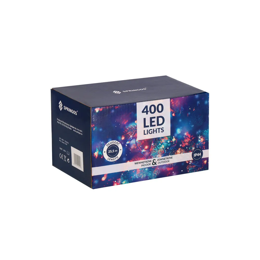 LED svetelná reťaz vhodná pre vnútorné aj vonkajšie použitie. Úsporné ľad diódy, vodeodolné prevedenie, krytie IP44. Dĺžka svetelnej časti 32 m, napájací kábel 1,5 m. Farba studená biela, 400 ľad.