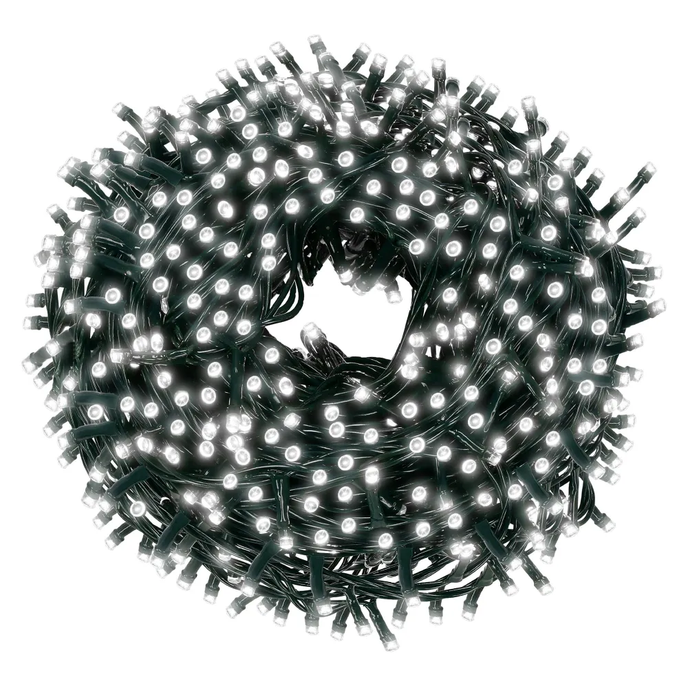 LED svetelná reťaz pre vianočné osvetlenie. Adaptér na bezpečné napätie, 8 svetelných funkcií, pamäť na posledný režim. Ultra úsporné mikro diódy, vonkajšie aj vnútorné použitie, certifikácia CE, RoHs, IP44. Dĺžka svetelnej časti 25 m, napájací kábel 2,5 m. Farba studená biela, 500 LED.