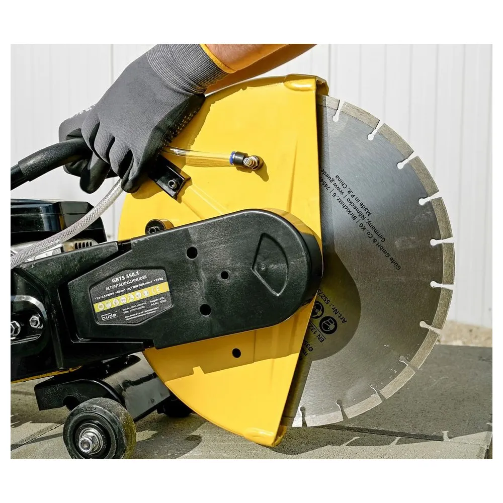 Rezačka na betón umožňuje priame rezanie betónových povrchov a iných dlažieb. Rezačku jednoducho ovláda a prenesie jedna osoba. Vďaka výkonnému, vzduchom chladenému dvojtaktnému motoru s výkonom 3,9 koní a zdvihovým objemom 65 cm3 dokáže tento stroj dobre prerezať aj hrubšie materiály. Pílový kotúč vyrobený z odolného a pevného diamantu umožňuje rýchle rezanie veľkých plôch. Vďaka procesu rezania za mokra a za sucha je možné stroj používať, aj keď je povrch mokrý. Zariadenie má hadicovú spojku na záhradné hadice na mokré rezanie, tlak vody je možné regulovať pomocou ventilov na pílovom kotúči. Ideálne na skracovanie zaoblených a zapustených obrubníkov, frézovanie betónových povrchov, rezanie dlažobných kociek a betónových kvádrov. V balení sa nachádza diamantový rezací kotúč Ø 350 mm (1 ks), náhradný vzduchový filter (3 ks).
