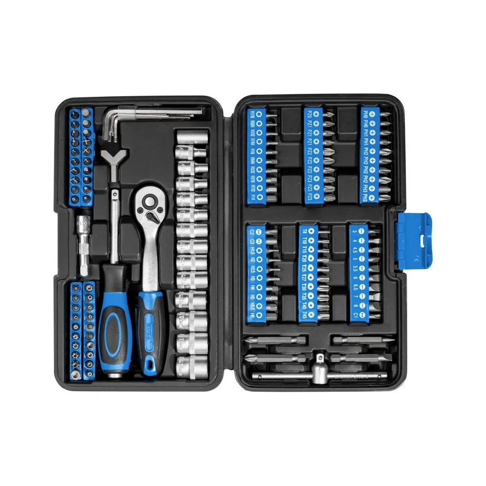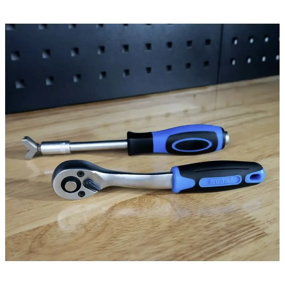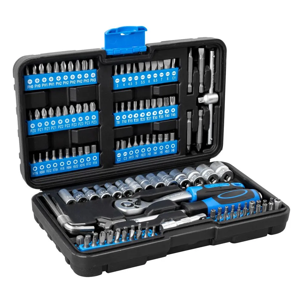 Sada náradia z chróm-vanádiovej ocele v praktickom plastovom kufríku zahŕňa 2 račne (1/2" a 1/4" so 72 zubami) s predĺženiami a...