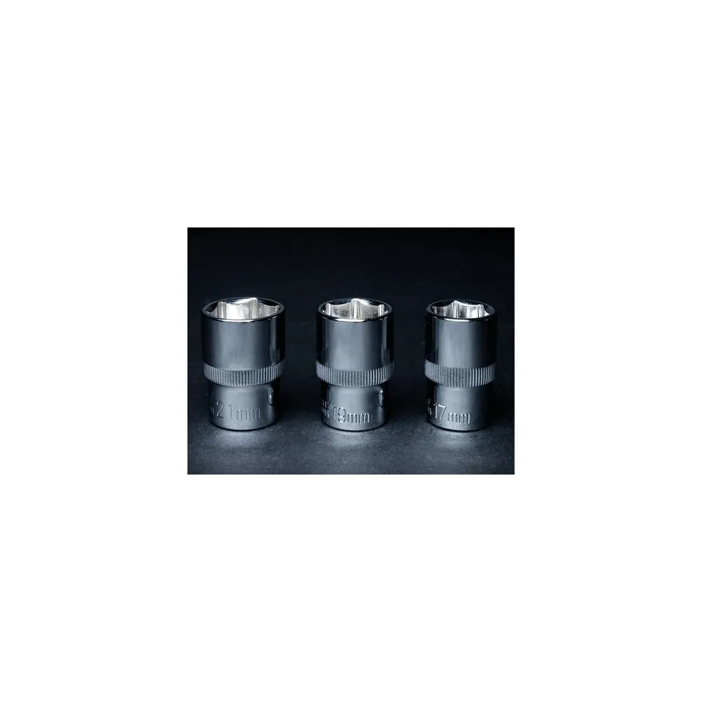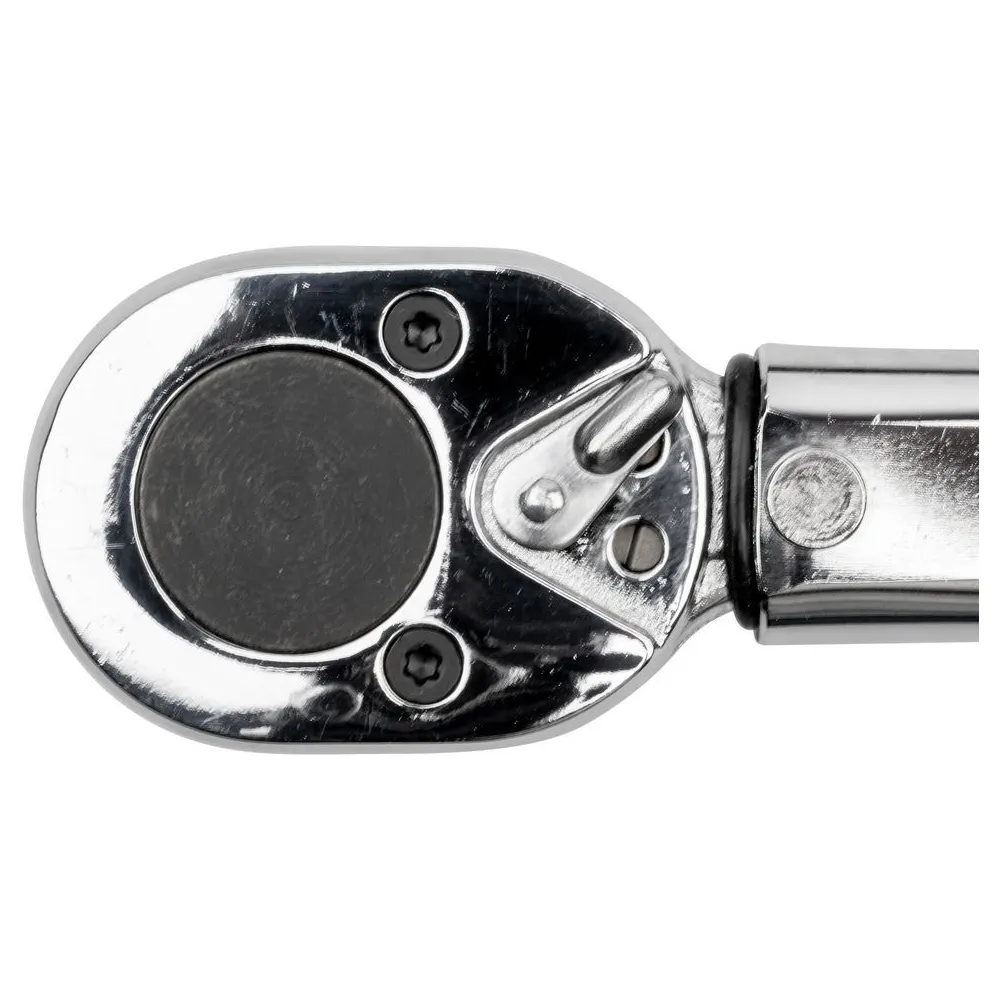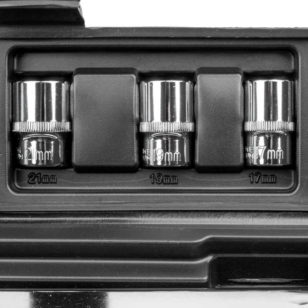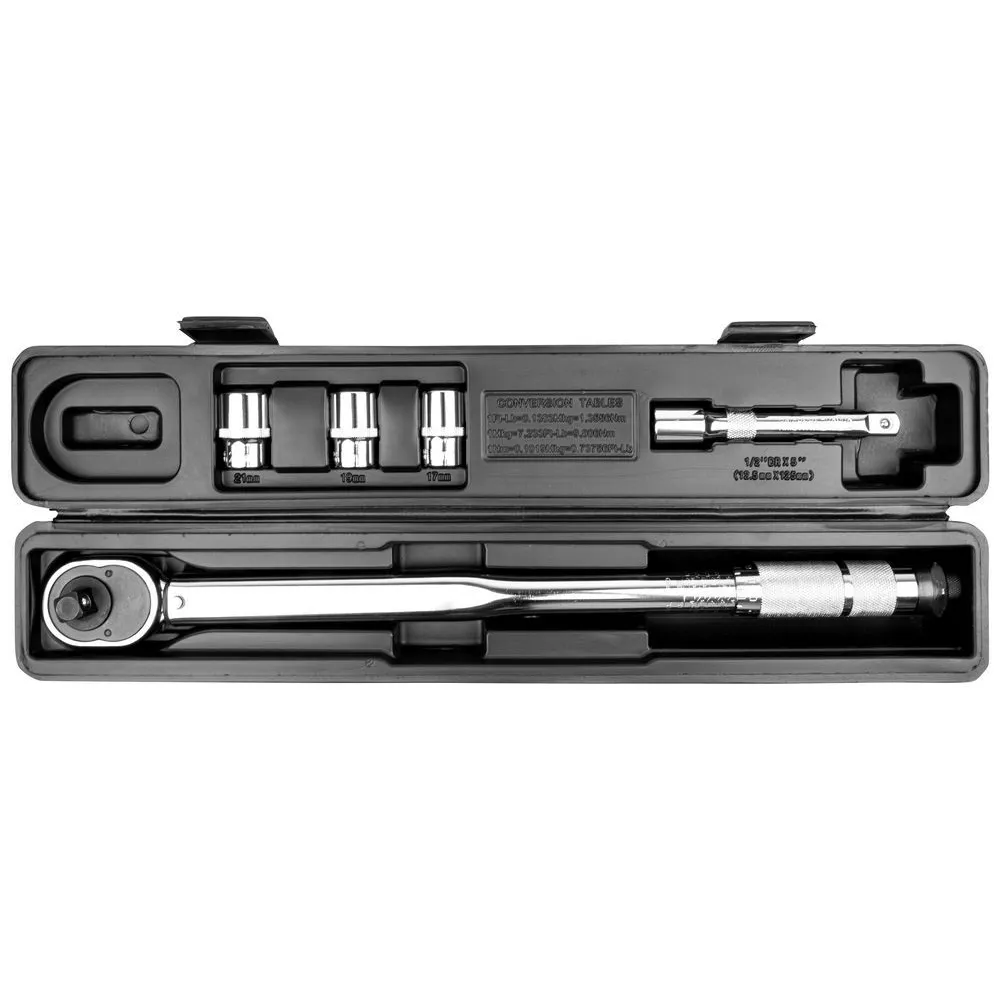 Súprava momentového kľúča, 3 nástrčkových kľúčov a predĺženie 125 mm. Guľôčková poistka na nástrčkové kľúče a predĺženie. Nástrčkové kľúče vo veľkostiach 17, 19 a 21 mm z chróm-vanádiovej ocele. Prepínacia páka na otáčanie doprava a doľava.