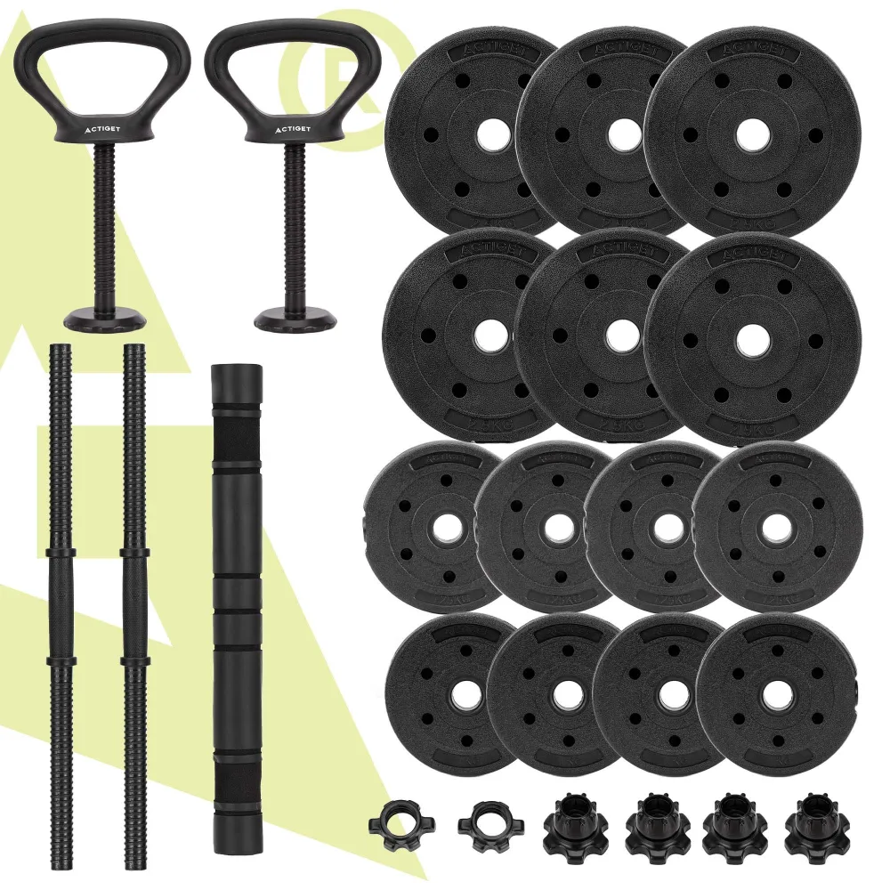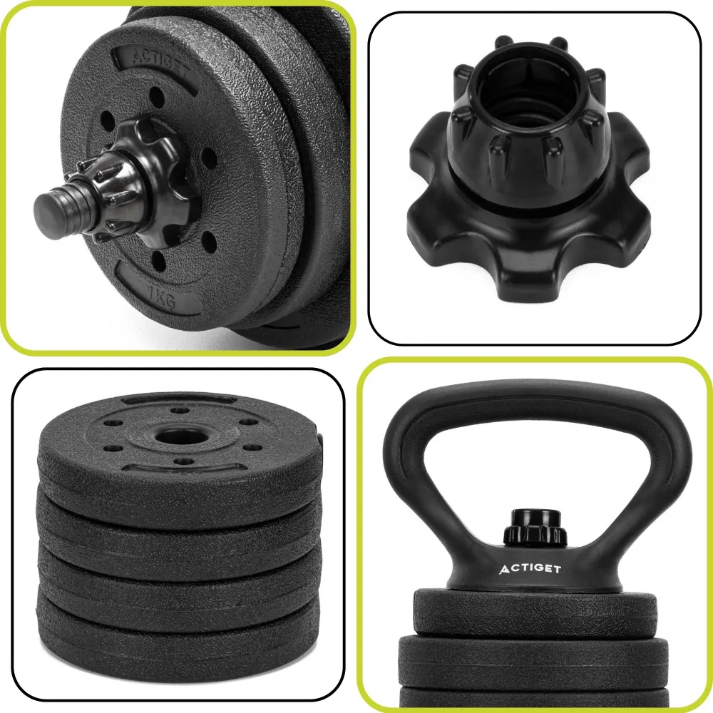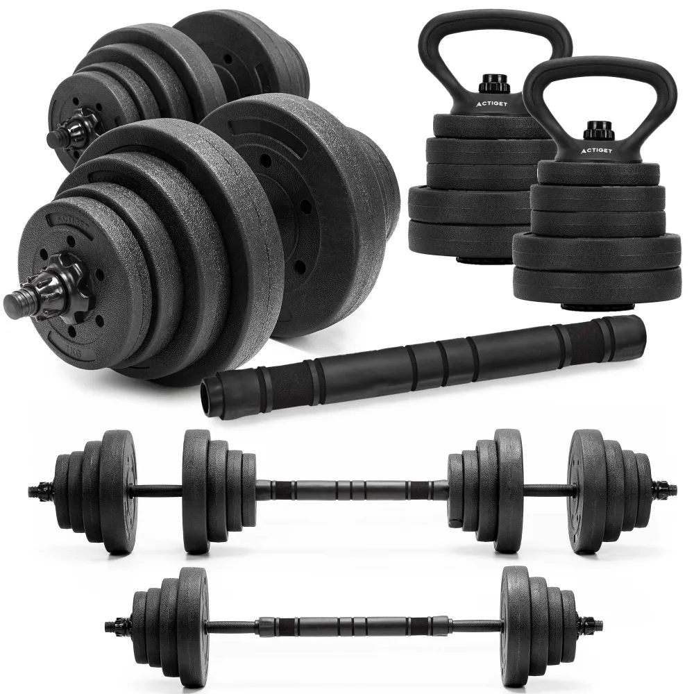 Multifunkčný činkový set 30 kg ACTIGET ACT0046 je ideálnym riešením pre každého, kto chce mať doma univerzálne vybavenie na kompletný silový tréning. Vďaka systému 4v1 umožňuje zostavenie ako jednoručné činky, obojručnú činku, vzpieračskú činku alebo nastaviteľné kettlebelly . V jednom sete tak získate riešenie pre desiatky cvikov na celé telo bez nutnosti dokupovať ďalšie vybavenie.