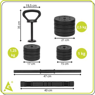 Súčasťou je 12 kotúčov v hmotnostiach 1 kg, 1,25 kg a 2,5 kg , ktoré umožňujú presné nastavenie záťaže podľa výkonnosti aj cieľa tréningu. Vďaka spojovaciemu konektoru je možné jednoducho meniť konfiguráciu činiek. Konektor s mäkčenou penou zaisťuje komfortný úchop a chráni ruky aj krk pri ťažších cvikoch. Ergonomické protišmykové rukoväte podporujú istý a bezpečný úchop.