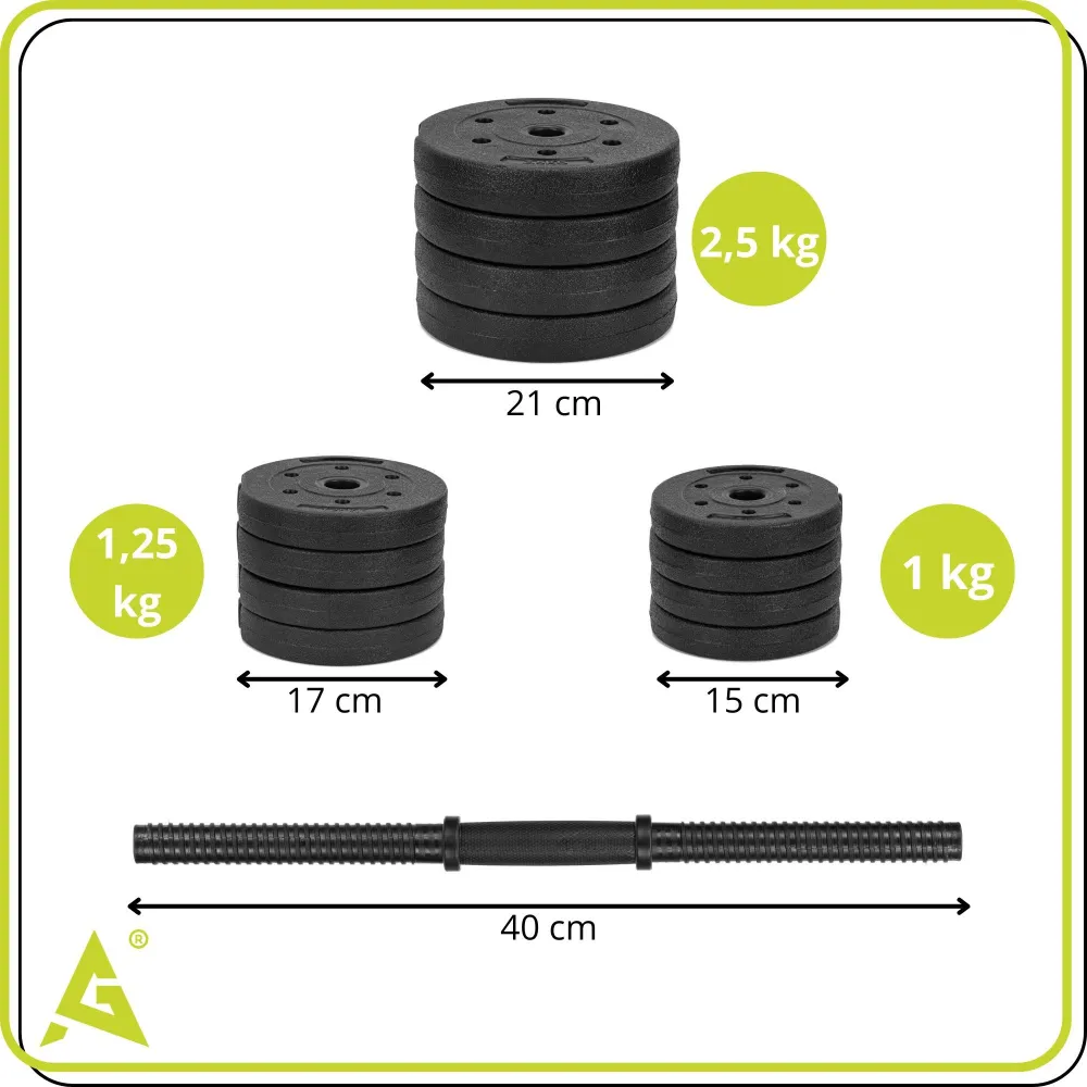 Univerzálny činkový set, vhodný pre domáci aj klubový tréning. Nakladacie jednoručné činky alebo obojručná činka, možnosť jednoduchej prestavby podľa cvičenia. Pestrá skladba 16 kotúčov, kombinácia hmotností 1, 1,25, 2,5 kg. Konektor s mäkčenou penou, pohodlný úchop bez otlakov. Celková hmotnosť 20 kg pre postupné zvyšovanie záťaže.