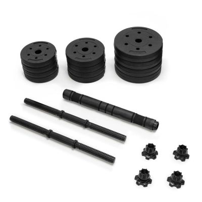 Súčasťou sady sú kotúče s hmotnosťou 1 kg, 1,25 kg a 2,5 kg, ktoré umožňujú jemné aj výraznejšie navyšovanie záťaže. Pomocou spojovacieho konektora je možné dve jednoručné činky jednoducho premeniť na obojručný variant. Konektor s mäkčenou penou zaisťuje pohodlný úchop a chráni ruky pred otlakmi aj pri dlhšom tréningu.