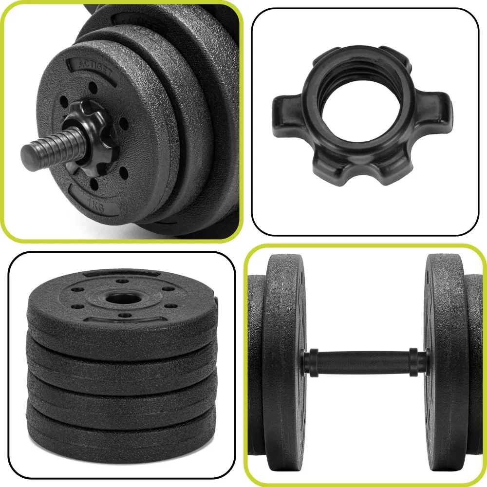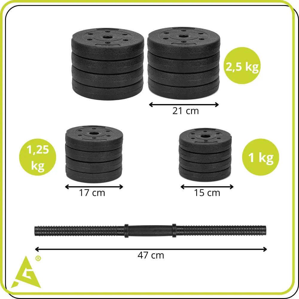 Súčasťou sady je pestrá skladba 16 kotúčov , ktorá umožňuje flexibilné kombinovanie hmotností. K dispozícii sú kotúče s hmotnosťou 1 kg, 1,25 kg a 2,5 kg , takže si záťaž ľahko nastavíte presne podľa svojich potrieb. Ideálne riešenie pre začiatočníkov i pokročilých, ktorí chcú mať plnú kontrolu nad svojim tréningom.