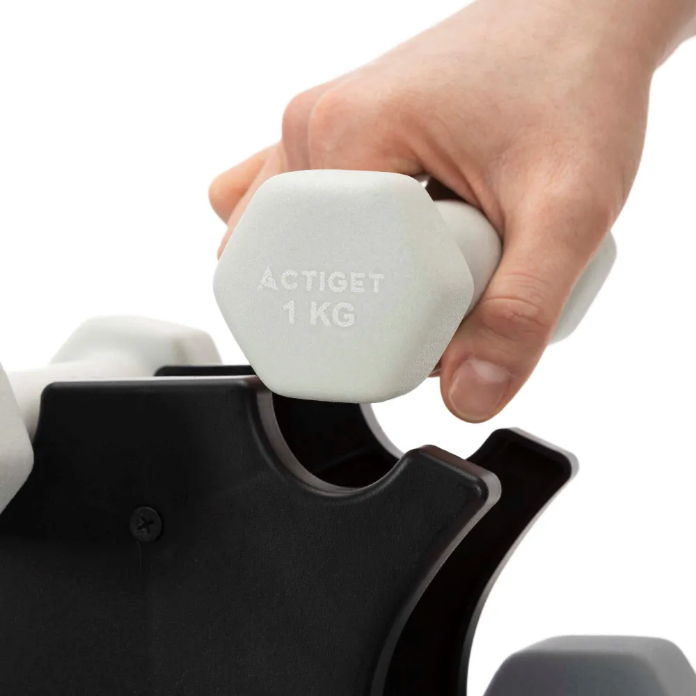 Sada činiek so stojanom 12 kg ACTIGET ACT0169 je ideálnym riešením pre každého, kto chce mať všetko prehľadne usporiadané a pripravené na tréning. Obsahuje 6 jednoručných činiek + stojan s kombináciou hmotnosťou 1 kg, 2 kg a 3 kg , vďaka ktorým ľahko prispôsobíte záťaž rozcvičeniu, kondičnému cvičeniu aj posilňovaniu. Liatinové jadro zaisťuje optimálne vyváženie a stabilitu pri každom cviku.