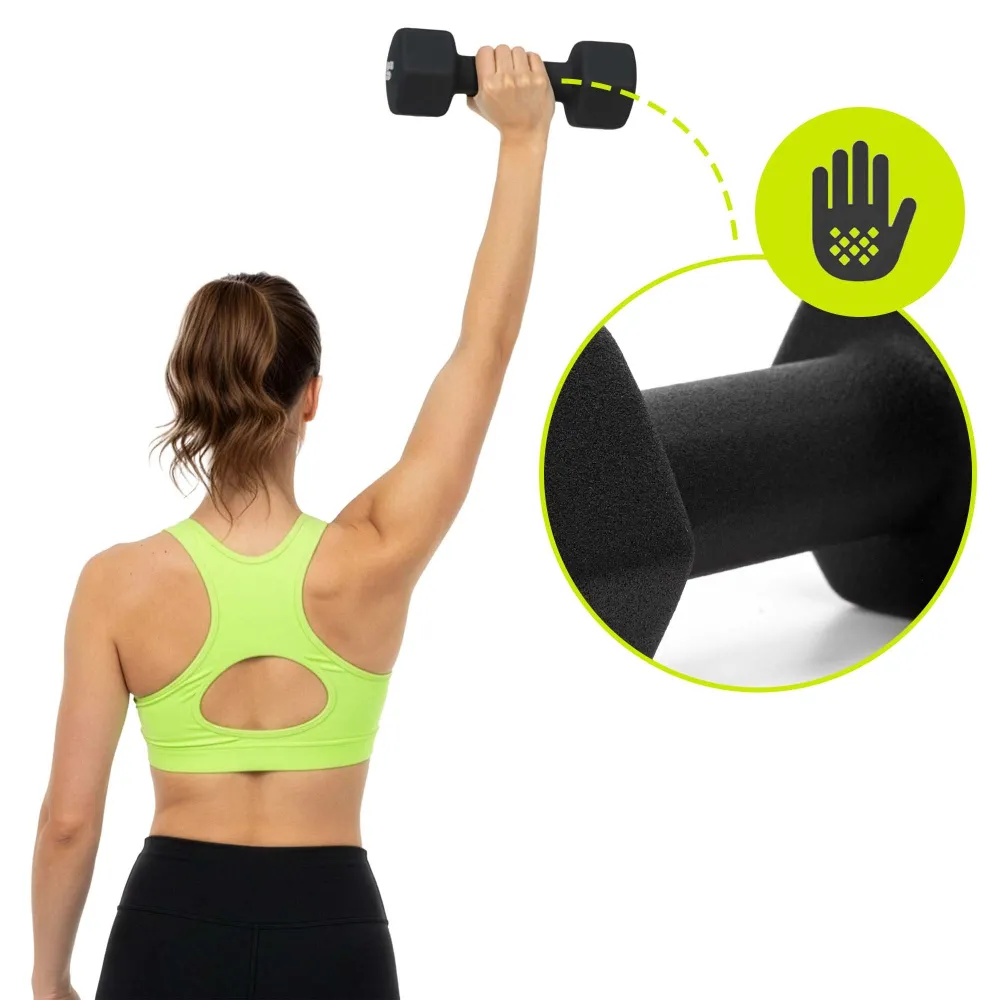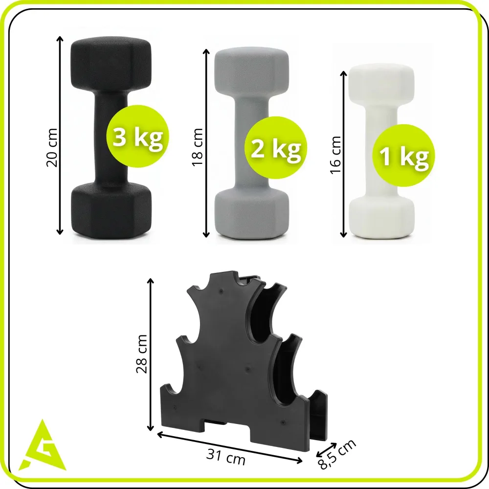 Činky sú opatrené neoprénovým, protišmykovým povrchom , ktorý poskytuje pohodlný a istý úchop aj pri intenzívnejšom tréningu. Ergonomický šesťhranný tvar proti kotáleniu zvyšuje bezpečnosť pri odložení. Súčasťou sady je odolný PVC stojan na prehľadné uloženie , vďaka ktorému budú činky vždy na svojom mieste a váš tréningový priestor zostane organizovaný.