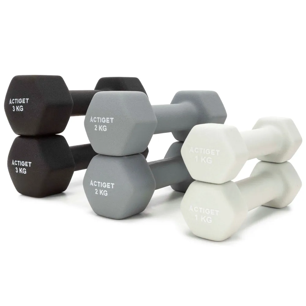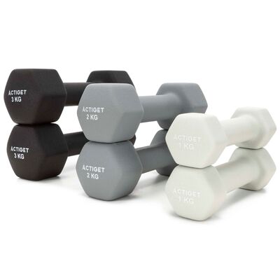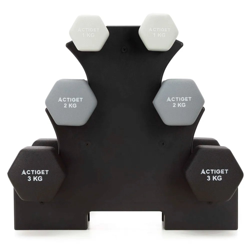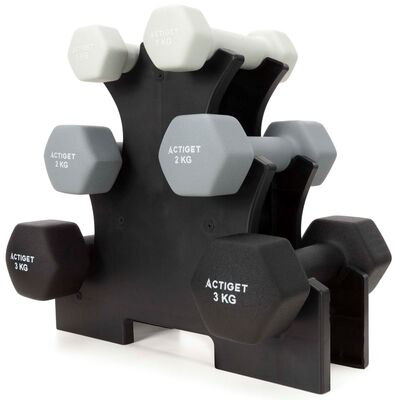 Kompletná sada 6 jednoručných činiek so stojanom s celkovou hmotnosťou 12 kg ponúka všetko pre domáci tréning. Kombinácia hmotnosťou 1, 2 a 3 kg je ideálna na rozcvičenie, kondičný tréning aj posilňovanie. Liatinové jadro s neoprénovým povrchom má príjemný a protišmykový úchop. Šesťhranný tvar bráni kotúľanie a pevný PVC stojan udržuje činky prehľadne uložené.