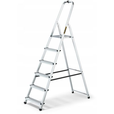 Hliníkové schodíky do domácnosti s praktickým háčikom na uchytenie vedra. 6 stupňov, max. pracovná výška 3,19 m, nosnosť 125 kg.