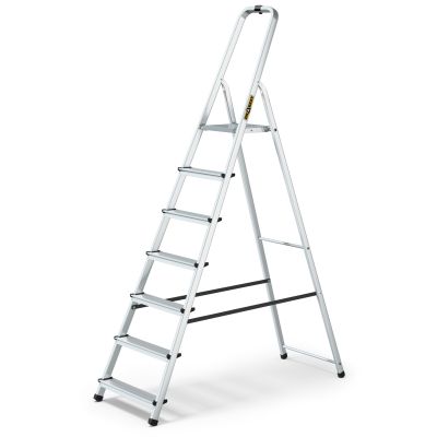 Hliníkové schodíky do domácnosti s praktickým háčikom na uchytenie vedra. 7 stupňov, max. pracovná výška 3,40 m, nosnosť 125 kg.