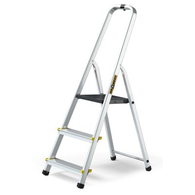 Profesionálne hliníkové schodíky na každodenné intenzívne používanie. 3 stupne, max. pracovná výška 2,54 m, nosnosť 150 kg, háčik na uchytenie vedra. Certifikácia TÜV Rheinland, EN 131 pre profi použitie.