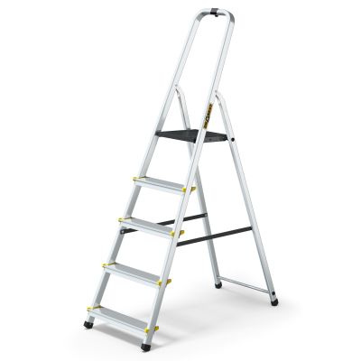 Profesionálne hliníkové schodíky na každodenné intenzívne používanie. 5 stupňov, max. pracovná výška 2,97 m, nosnosť 150 kg, háčik na uchytenie vedra. Certifikácia TÜV Rheinland, EN 131 pre profi použitie.