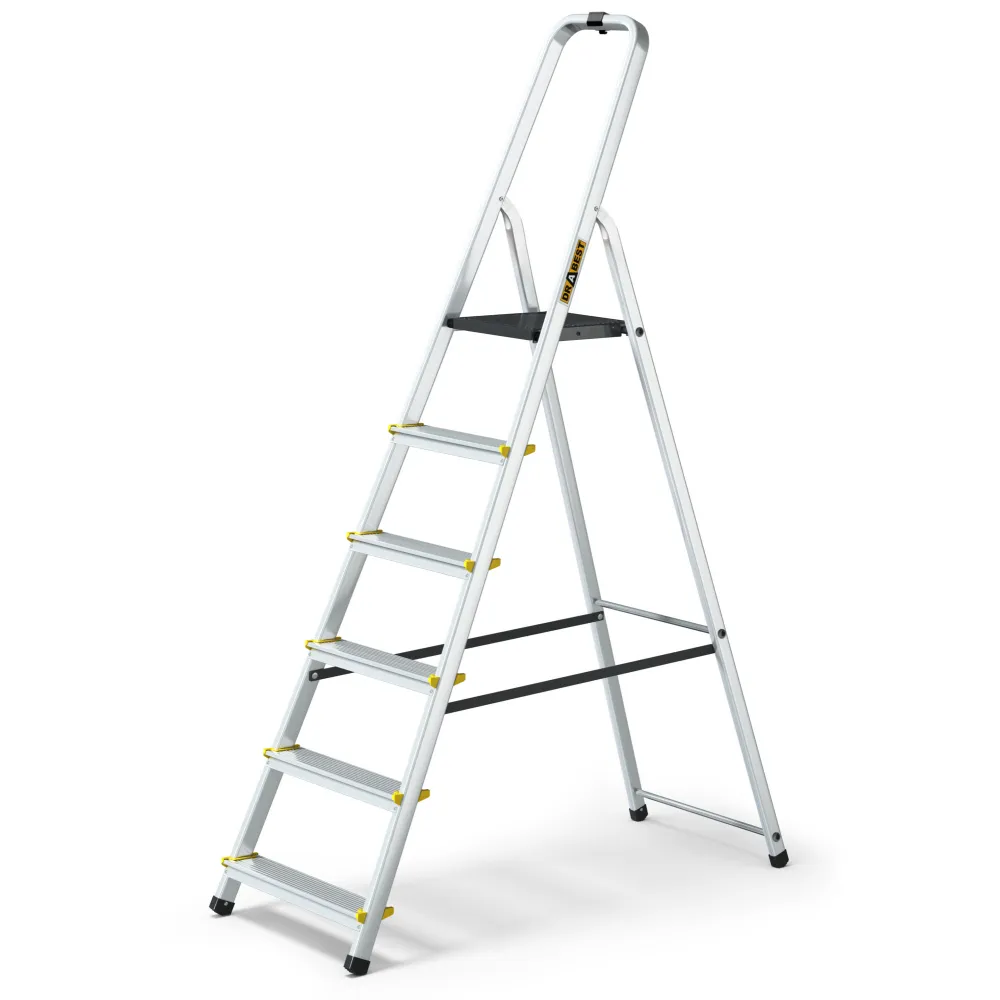 Profesionálne hliníkové schodíky na každodenné intenzívne používanie. 6 stupňov, max. pracovná výška 3,19 m, nosnosť 150 kg, háčik na uchytenie vedra. Certifikácia TÜV Rheinland, EN 131 pre profi použitie.