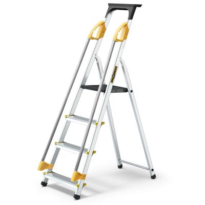 Robustné skladacie schodíky s madlami na každodenné intenzívne používanie. 4 stupne, jednostranné, max. pracovná výška 2,75 m, nosnosť 150 kg, polička na odloženie náradia s integrovaným háčikom na uchytenie vedra. Certifikácia EN 131 pre pofesionálne použitie.
