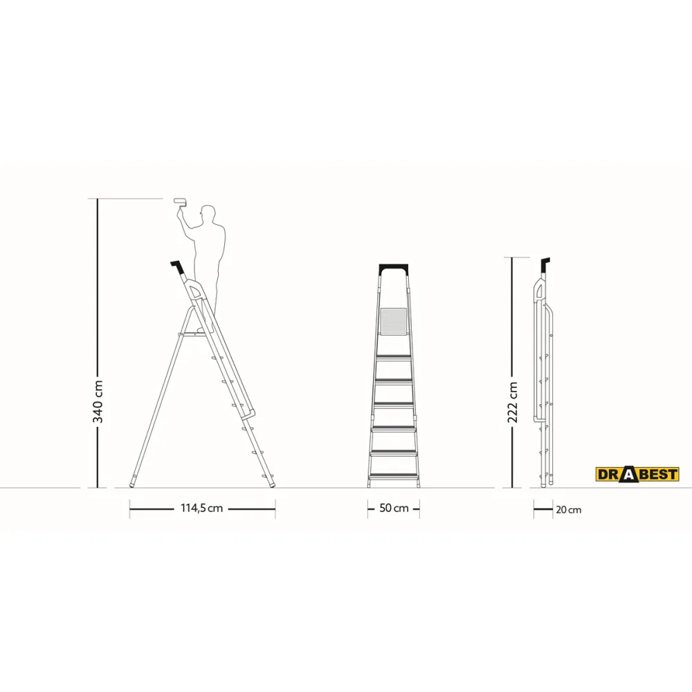 Hliníkové schodíky DRABEST ALDP+P-7 PRO sú vhodné na každodenné intenzívne používanie v priemysle, na stavbe a ďalších náročných odboroch vyžadujúcich nekompromisnú kvalitu. Schodíky spĺňajú prísne bezpečnostné normy podľa normy EN 131. Nosnosť činí 150 kg.