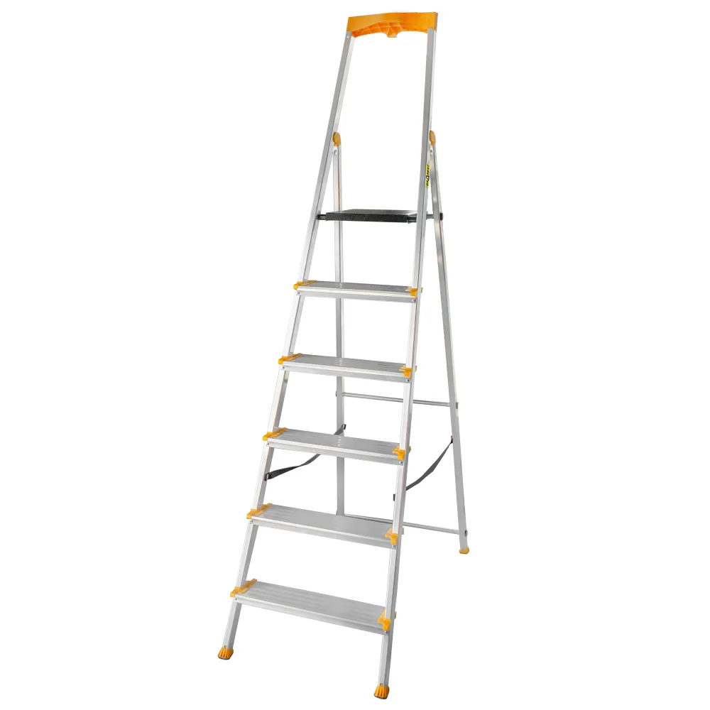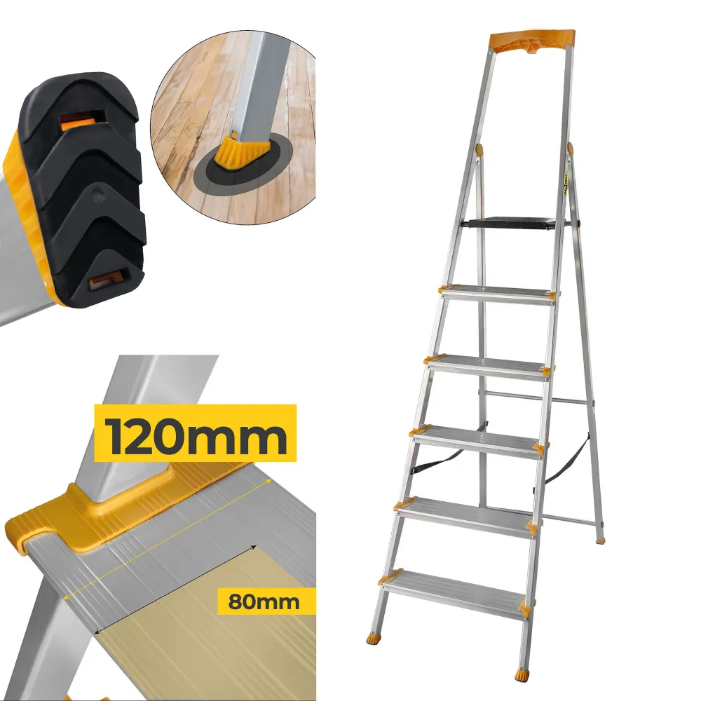 Profesionálne hliníkové schodíky na každodenné intenzívne používanie s predĺženými nášľapmi 120 mm. 6 stupňov, nosnosť 150 kg, výška podesty 1,26 m, max. pracovná výška 3,26 m. Integrovaná polička na náradie, háčik na uchytenie vedra, inovatívne protišmykové pätky. Certifikácia EN 131 pre profi použitie.