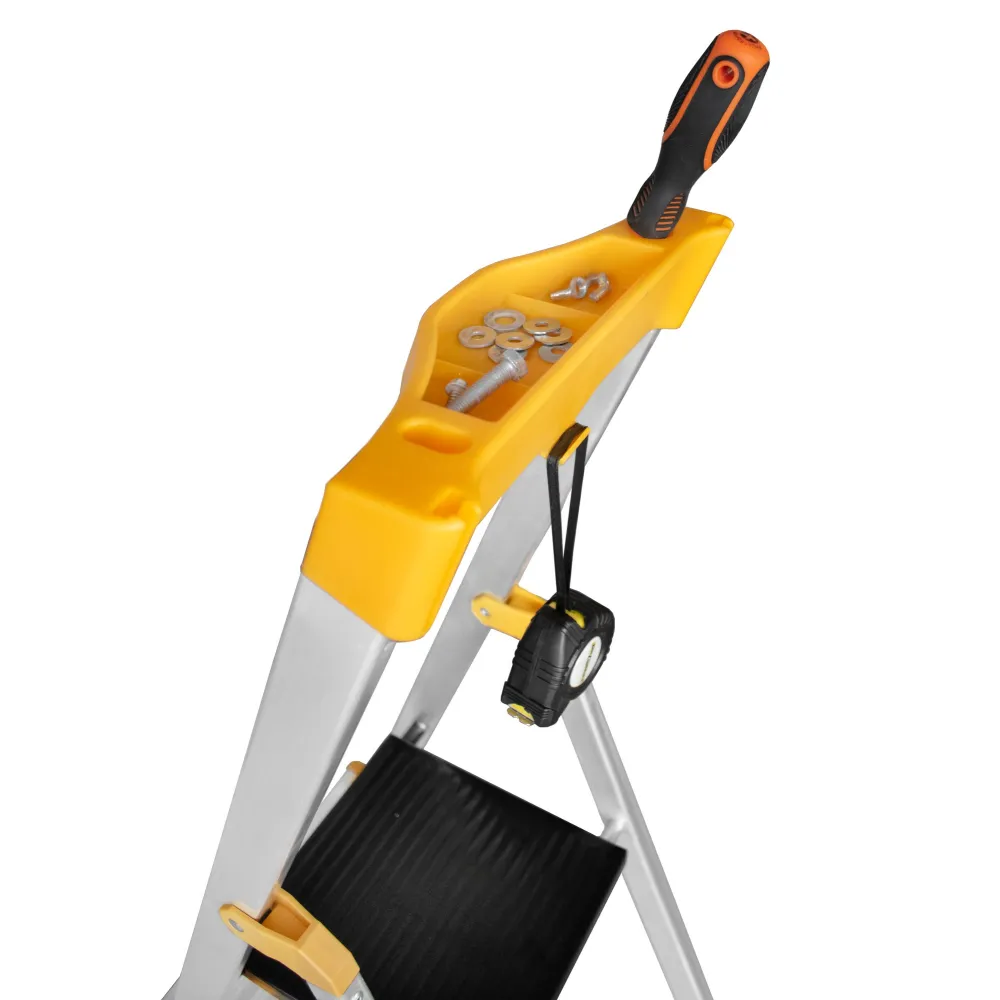 Pre väčšie pohodlie sú schodíky vybavené predĺženými nášľapmi o šírke 120 mm , ktoré poskytujú dostatočnú oporu a znižujú únavu pri dlhšom státí. Praktická integrovaná polička na náradie a háčik na uchytenie vedra umožňujú efektívnejšiu prácu bez nutnosti neustáleho zostupovania. Protišmykové pätky zaisťujú pevné uchytenie k podlahe a minimalizujú riziko nechceného pohybu.