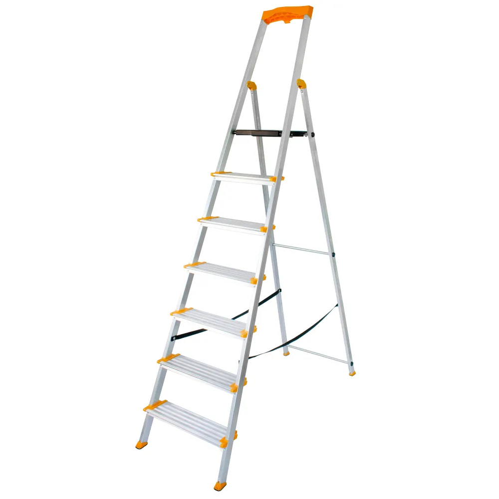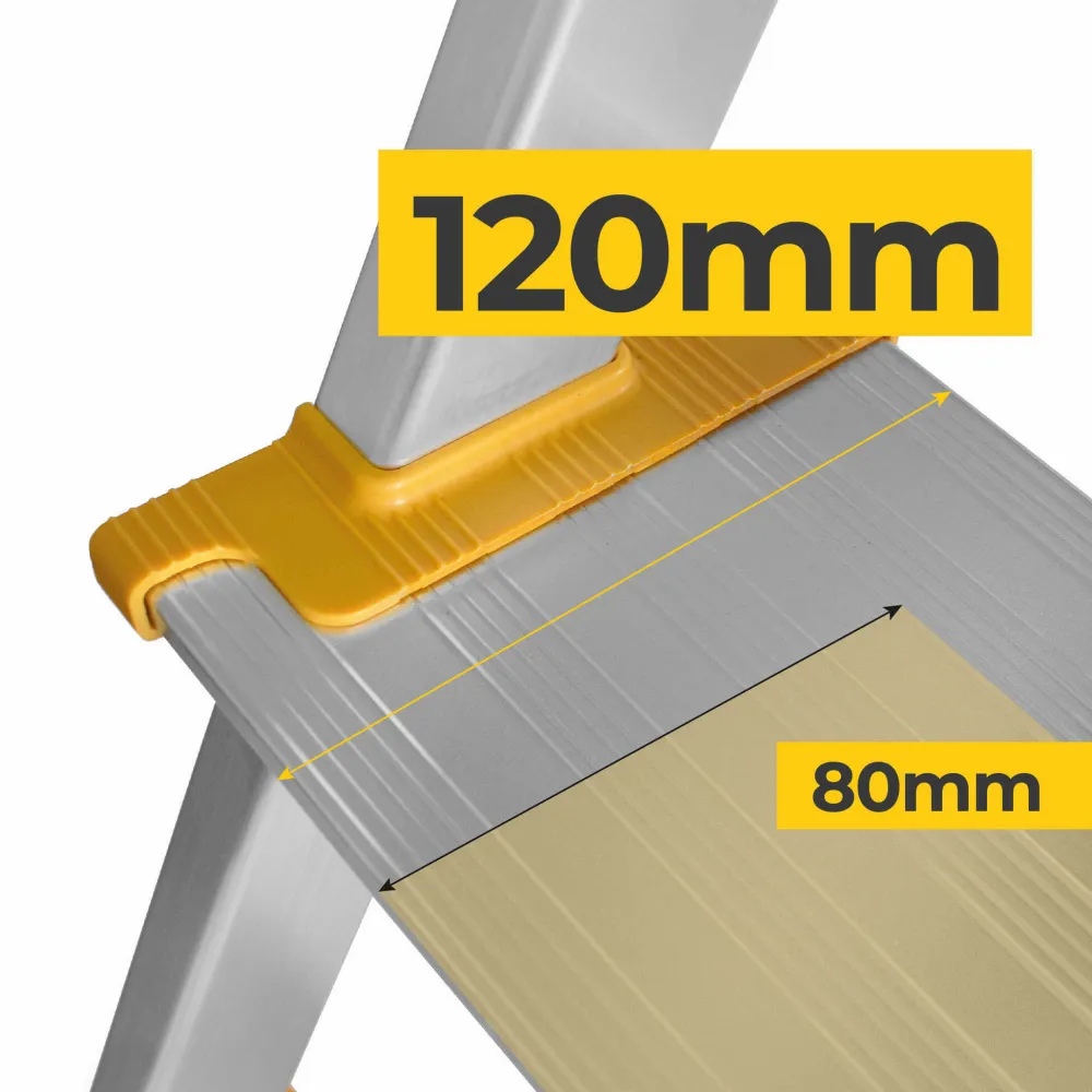 Profesionálne hliníkové schodíky na každodenné intenzívne používanie s predĺženými nášľapmi 120 mm. 7 stupňov, nosnosť 150 kg, výška podesty 1,47 m, max. pracovná výška 3,47 m. Integrovaná polička na náradie, háčik na uchytenie vedra, inovatívne protišmykové pätky. Certifikácia EN 131 pre profi použitie.