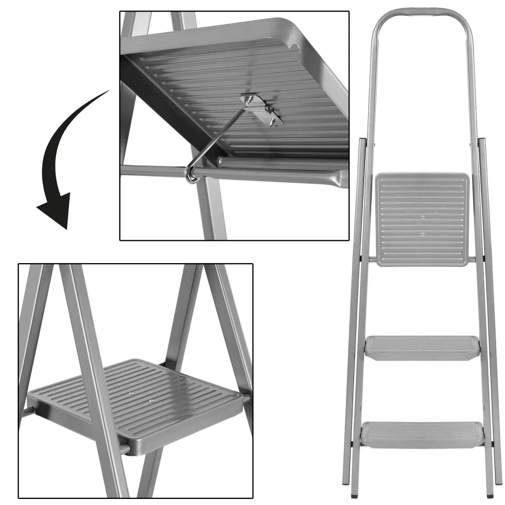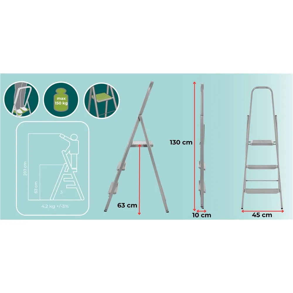 Praktické domáce schodíky s 3 stupňami vynikajú kompaktnou skladacou konštrukciou a bezpečnostným madlom pre jednoduché a bezpečné používanie. Výška plošiny 63 cm, max. pracovná výška 263 cm, nosnosť 150 kg. Protišmykové nášľapy, plošina aj nožičky zaisťujú stabilitu pri práci. Vysoko pevné a odolné prevedenie, moderná antikorózna úprava a nízka hmotnosť robia zo schodíkov ideálneho pomocníka do domácnosti.
