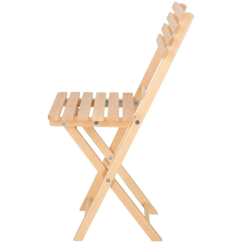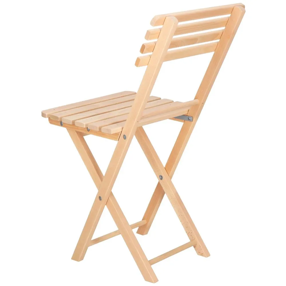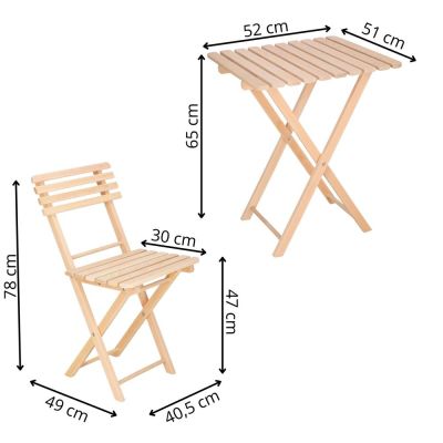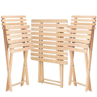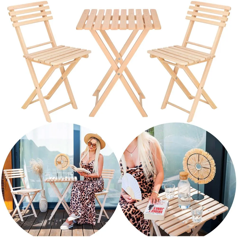 Elegantný set dreveného nábytku stôl a dve stoličky, ideálny pre menšie priestory a balkóny. Vyrobené z pevného bukového dreva s vysokou odolnosťou voči poveternostným vplyvom. Vďaka praktickému skladaciemu prevedeniu sa ľahko prenáša a uskladňuje. Vhodné na vonkajšie použitie. Nosnosť stoličky 125 kg, stôl 30 kg.