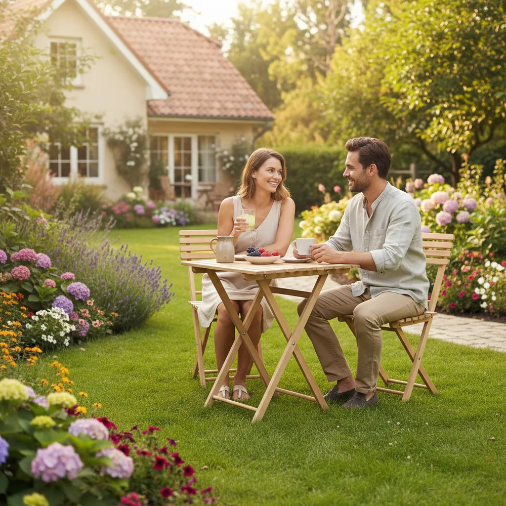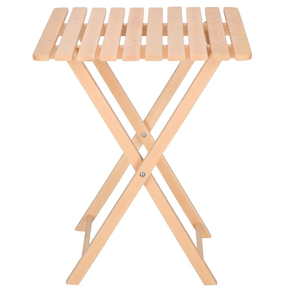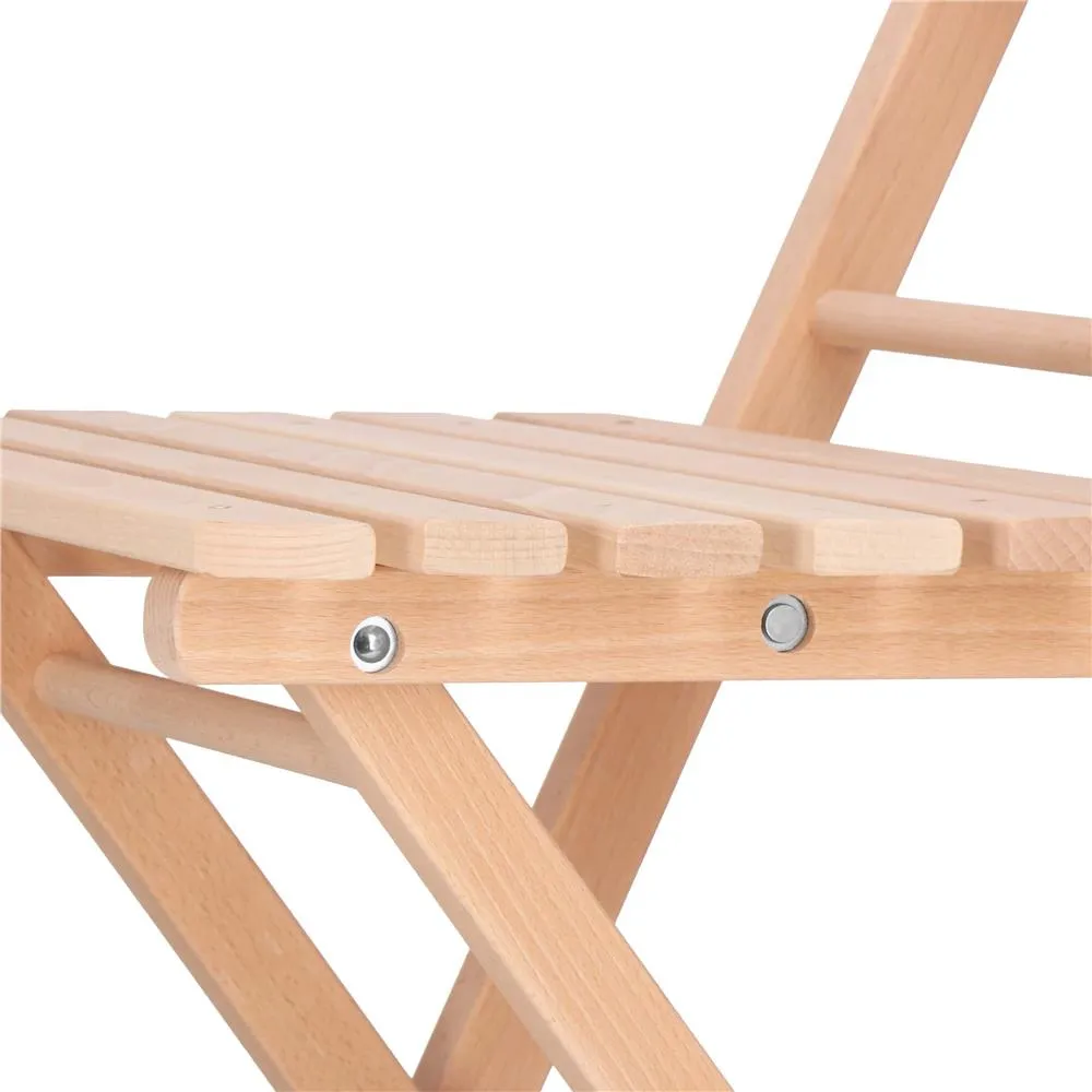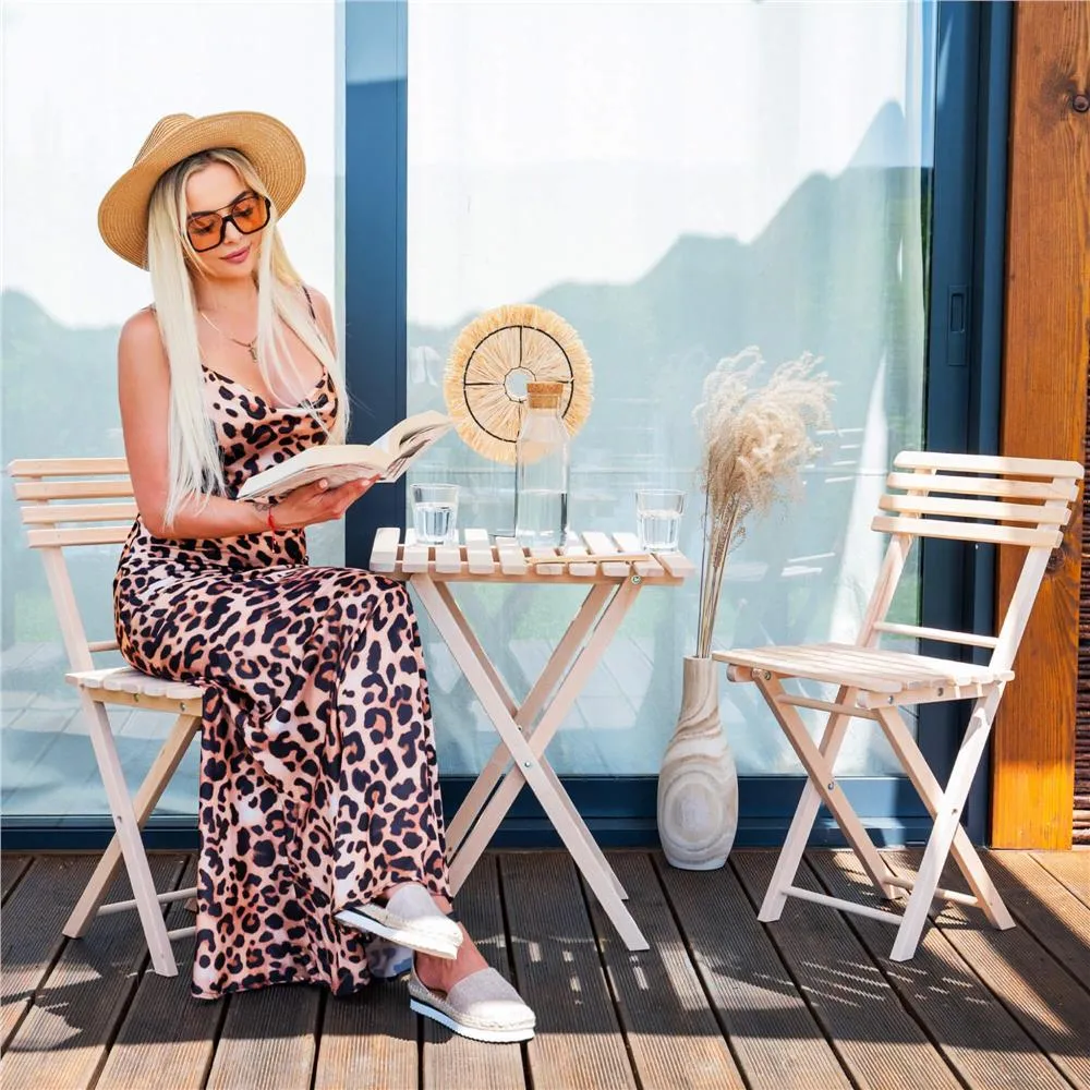 Elegantný set dreveného nábytku stôl a dve stoličky, ideálny pre menšie priestory a balkóny. Vyrobené z pevného bukového dreva s vysokou odolnosťou voči poveternostným vplyvom. Vďaka praktickému skladaciemu prevedeniu sa ľahko prenáša a uskladňuje. Vhodné na vonkajšie použitie. Nosnosť stoličky 125 kg, stôl 30 kg.
