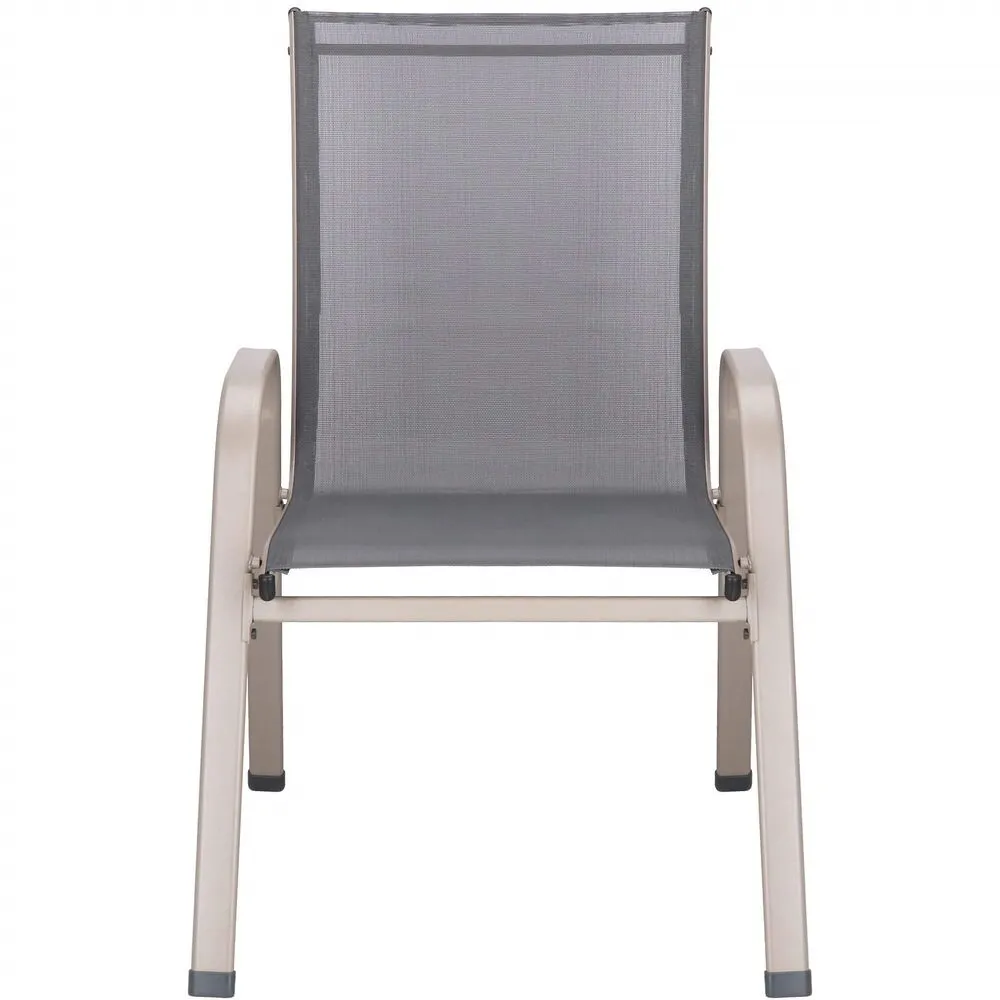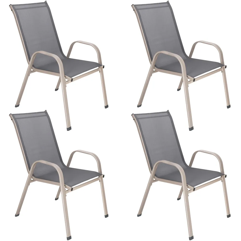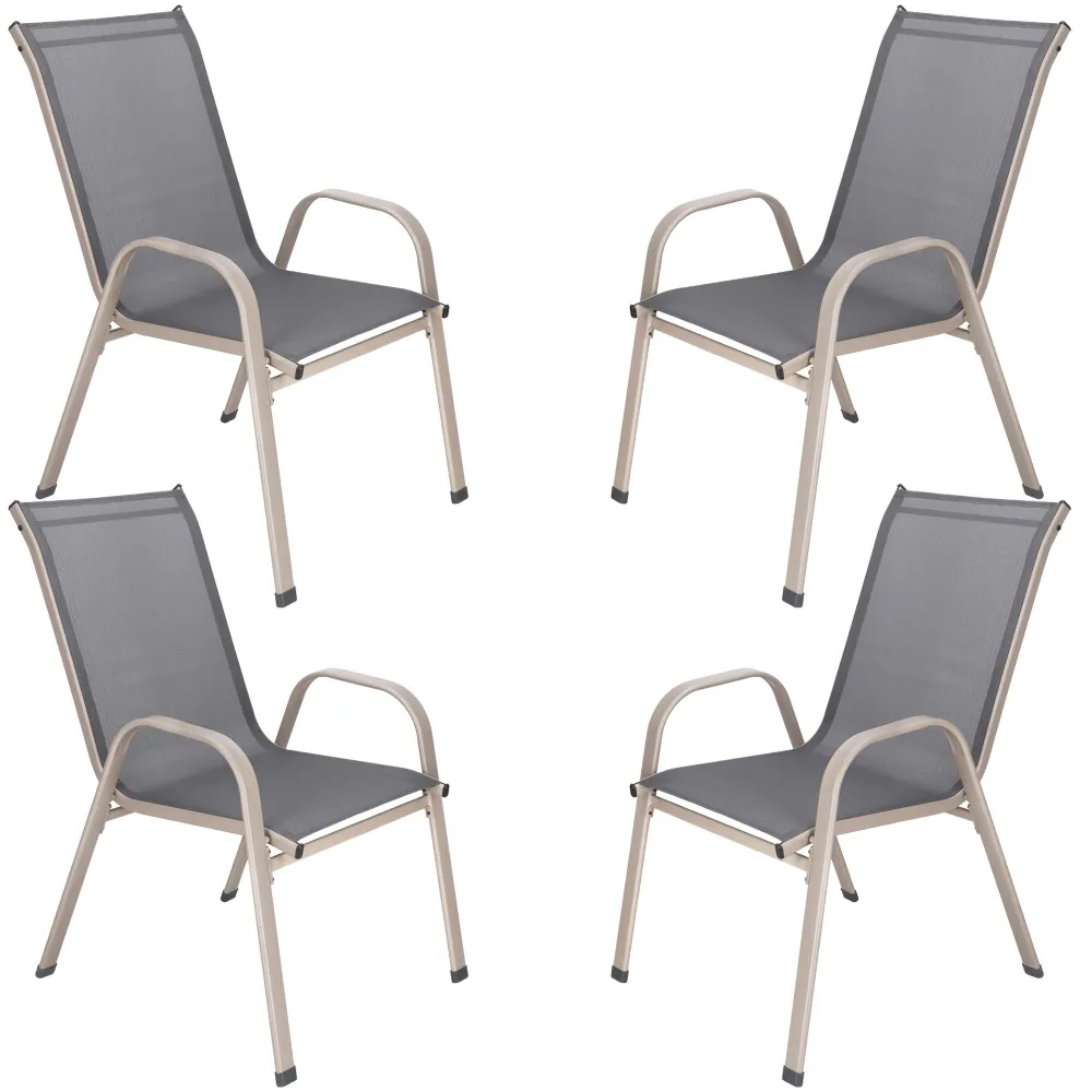 Zostava 4ks záhradných stoličiek / kresiel s textilným výpletom. Ergonomický tvar, vysoká opierka chrbta, široké podrúčky, stohovateľné, ultra ľahká a pevná kovová konštrukcia. Nosnosť 100 kg.