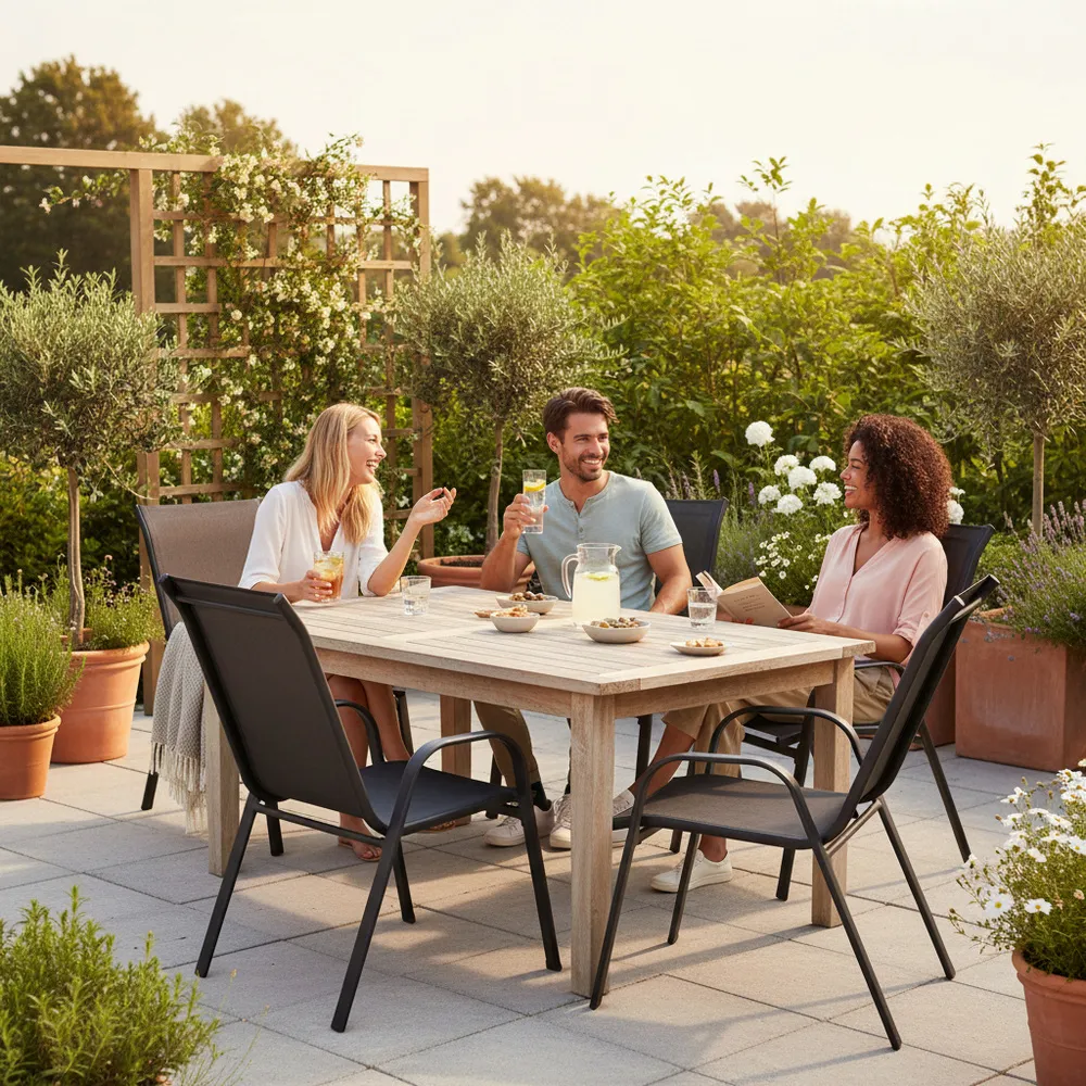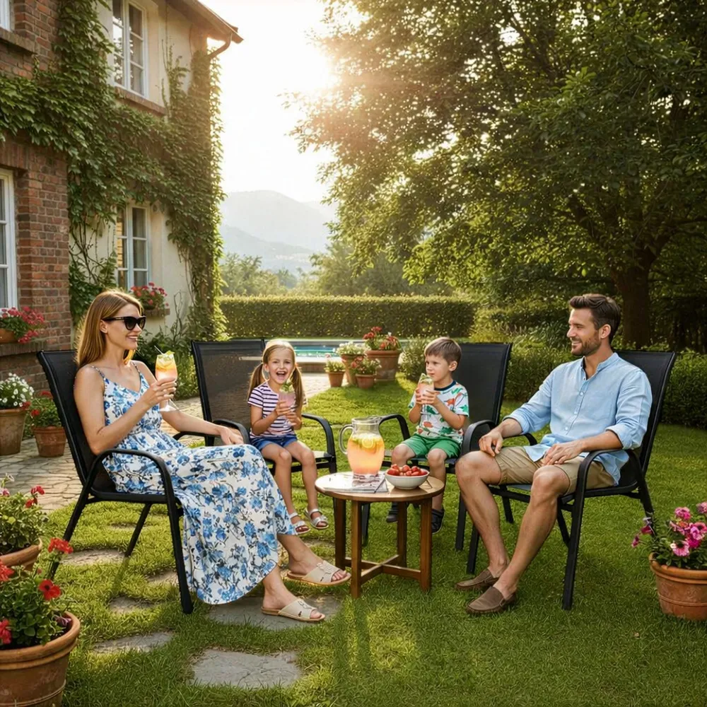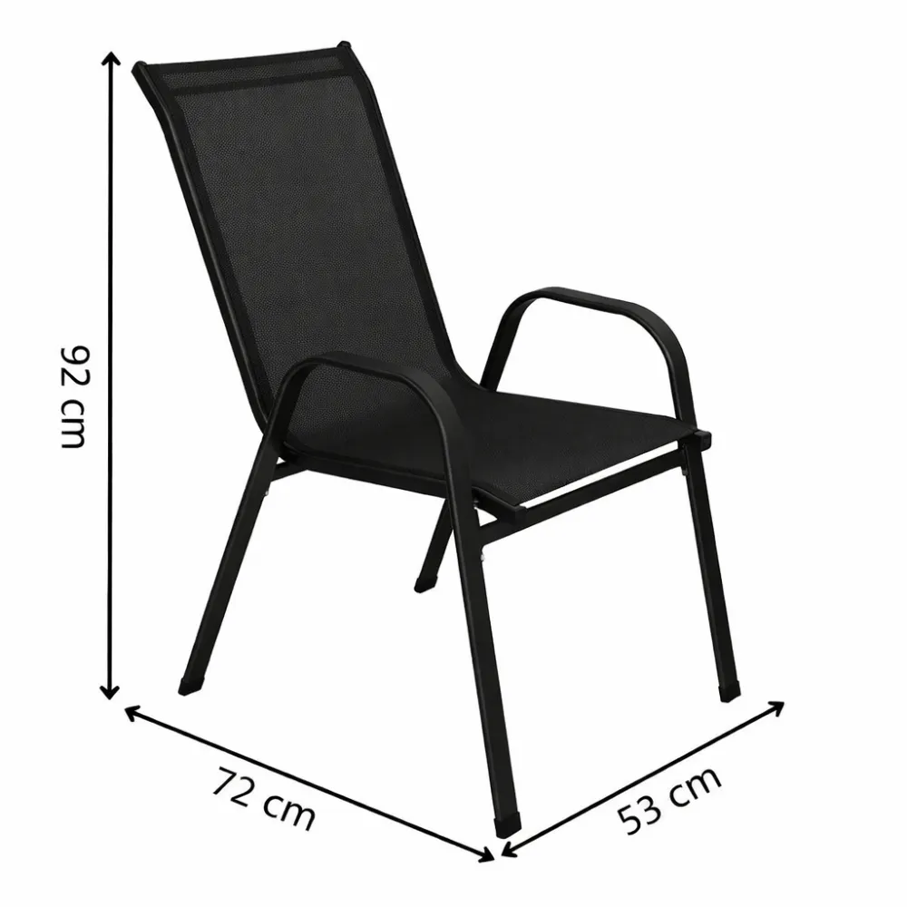 Set 4x záhradná stolička SPRINGOS MONZA GF0071H v elegantnej čiernej farbe je ideálnou voľbou pre balkón, terasu aj záhradu. Tieto stoličky zaujmú vysokým operadlom a širokými podrúčkami , ktoré zaisťujú maximálne pohodlie pri sedení. Textilný podsedák je navrhnutý tak, aby bol priedušný a neabsorboval vlhkosť , čo z neho robí perfektné riešenie pre vonkajšie použitie.